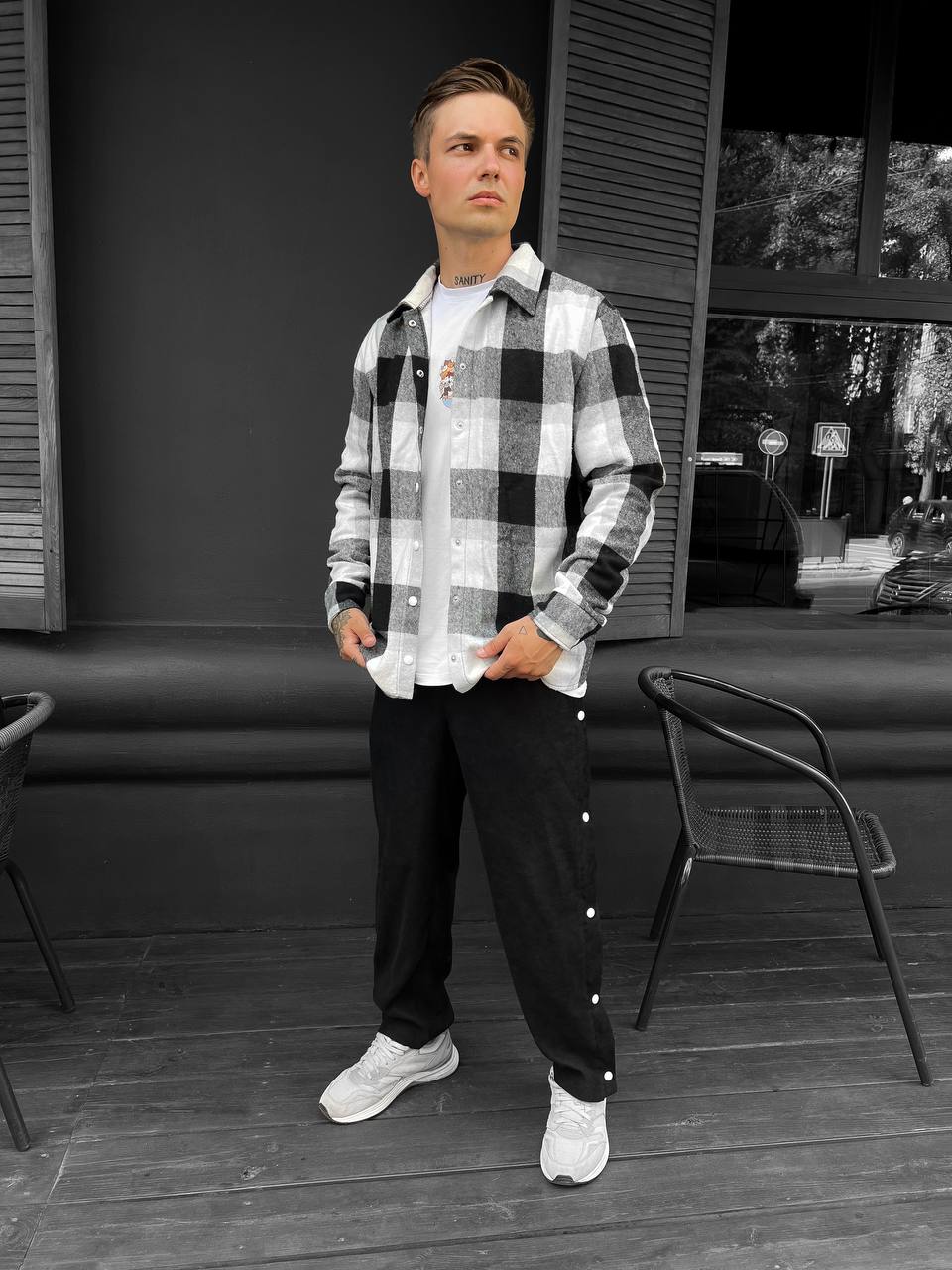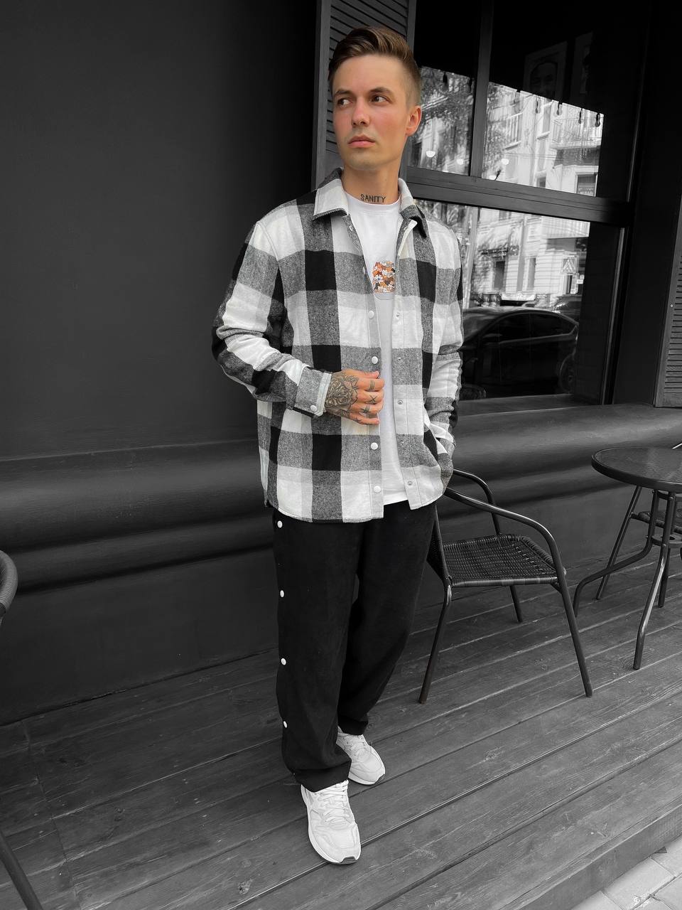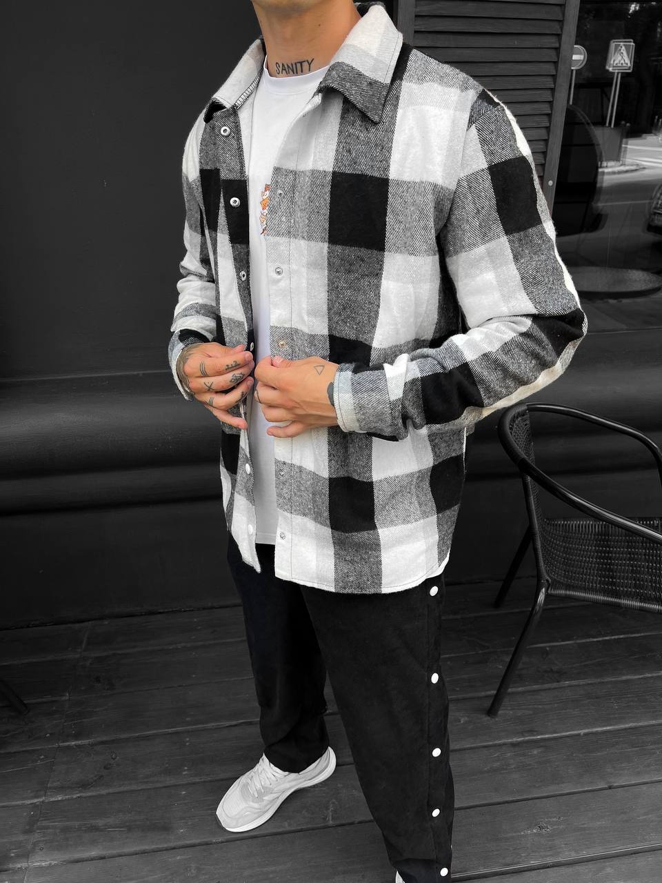 Мужская Байковая Черно-Белая Рубашка Свободного Фасона на Кнопках