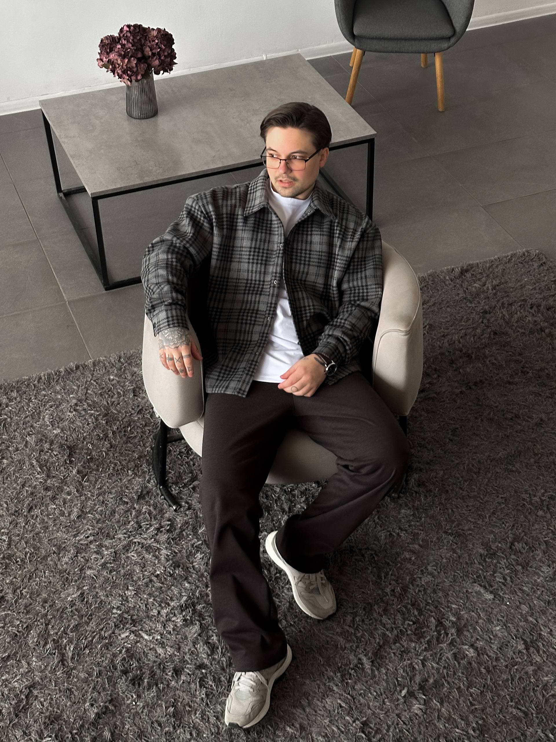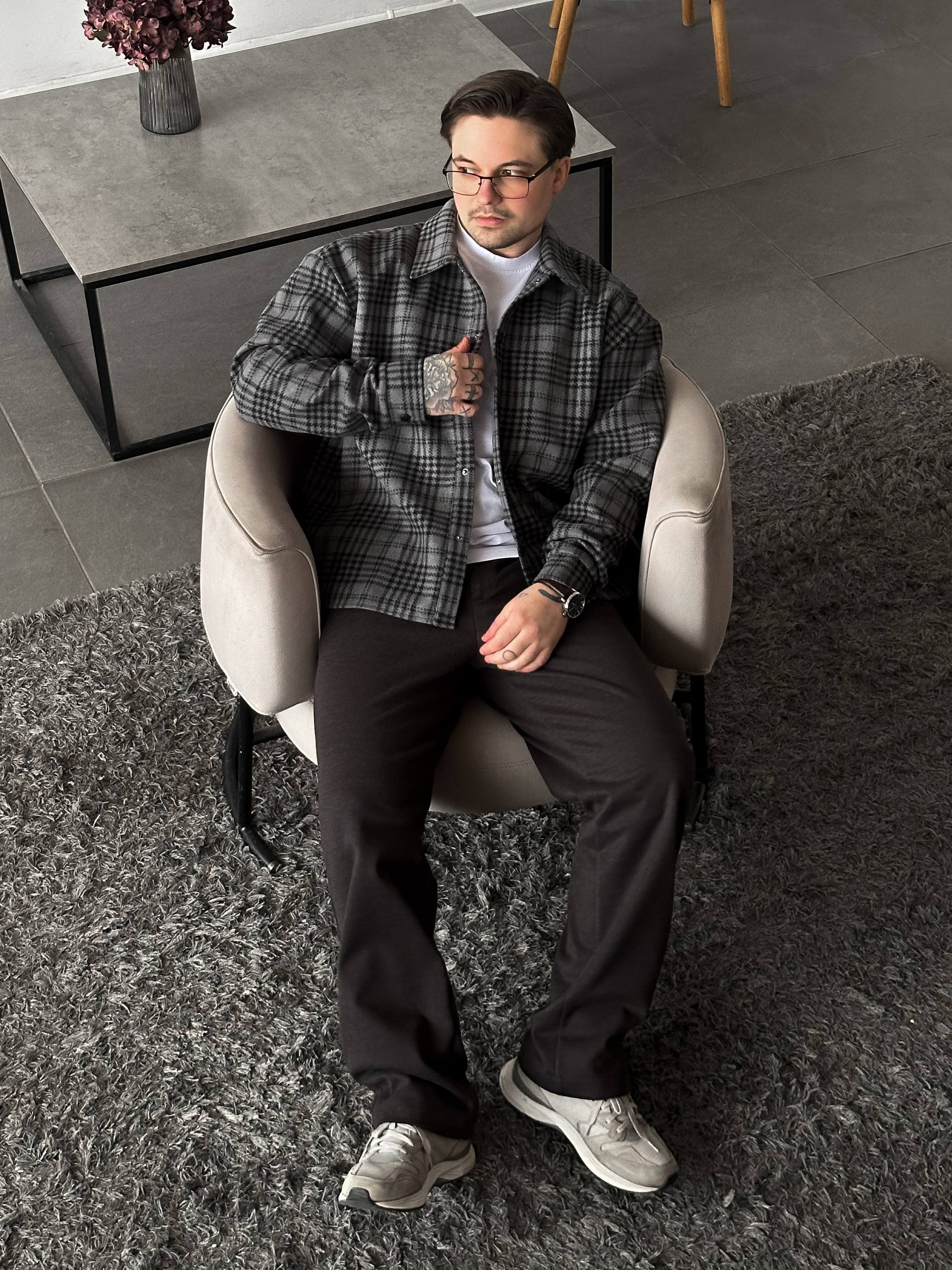 Мужская Байковая Графитовая Клетчатая Рубашка Свободного Кроя
