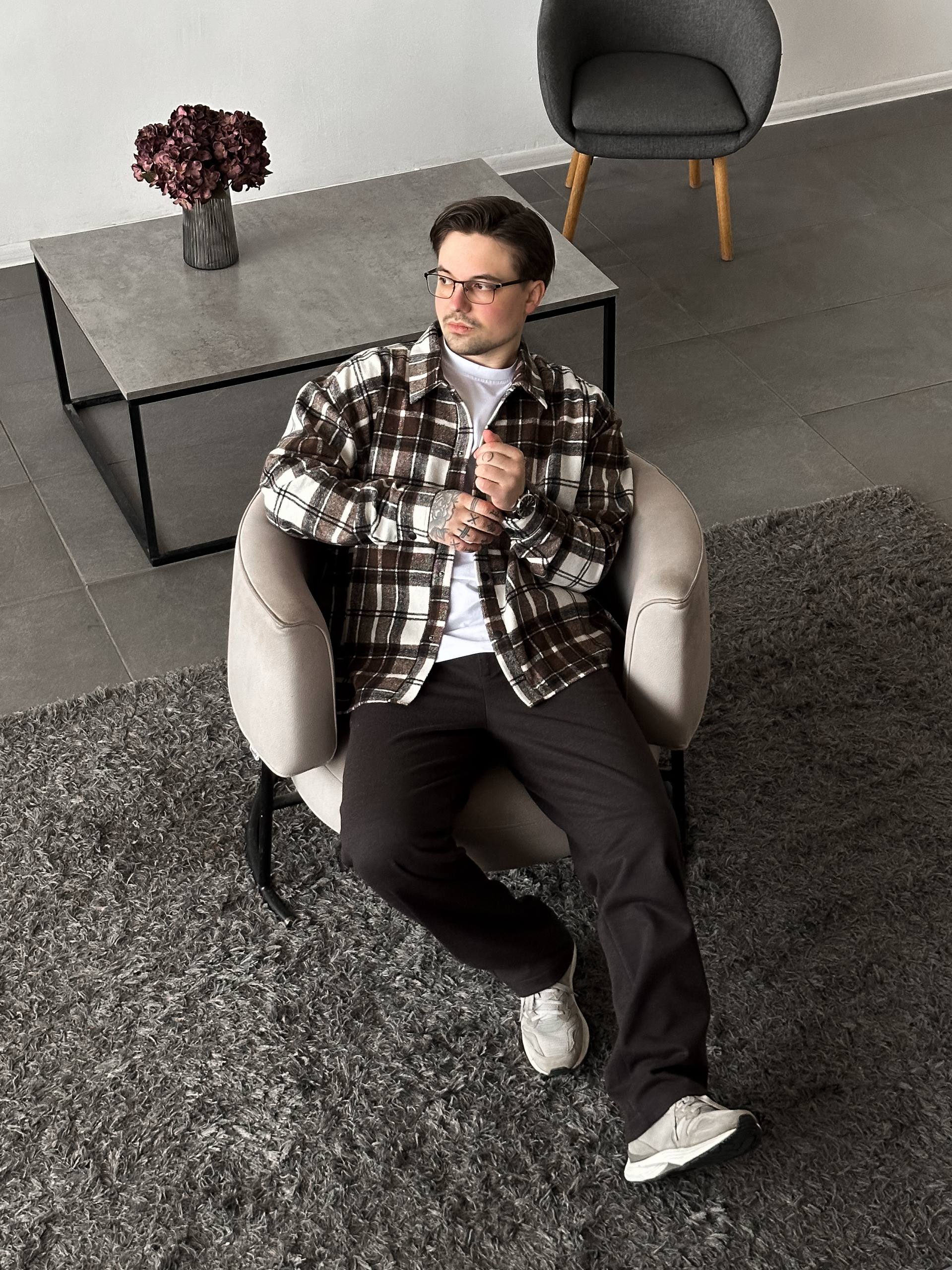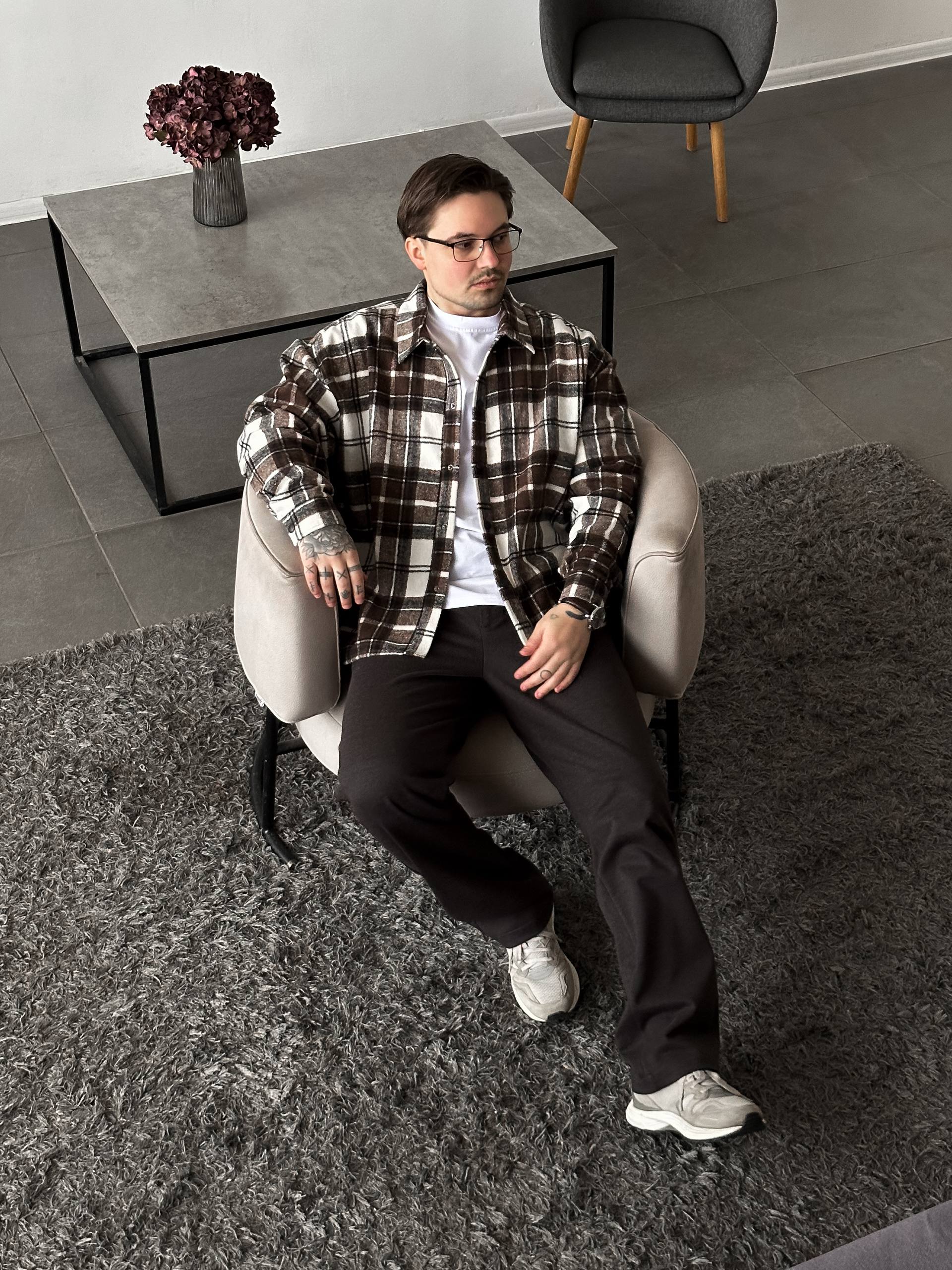 Мужская Байковая Шоколадная Клетчатая Рубашка Свободного Кроя