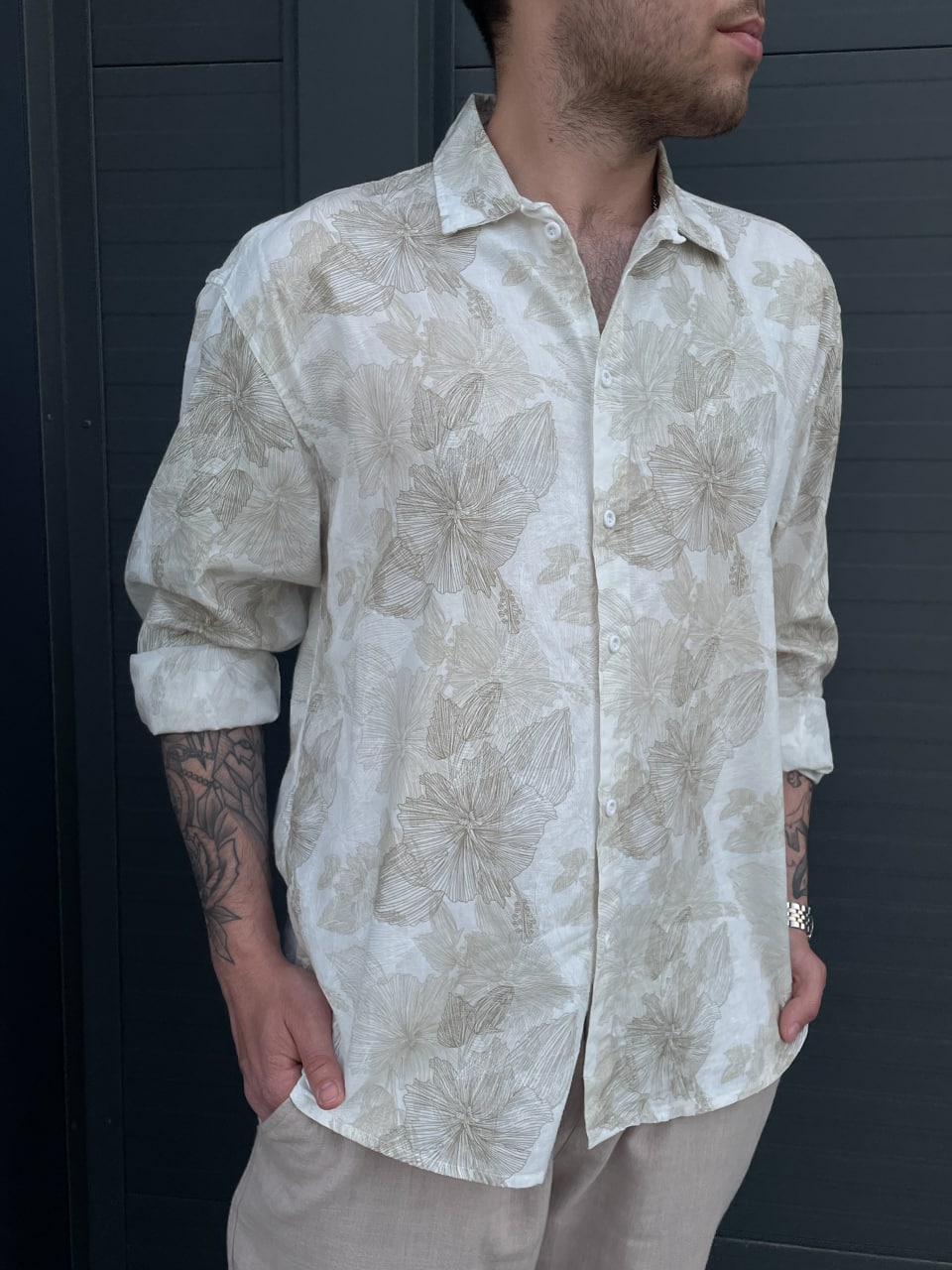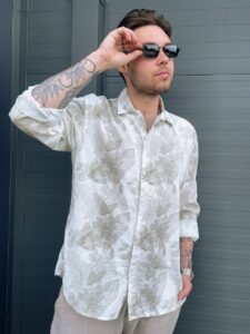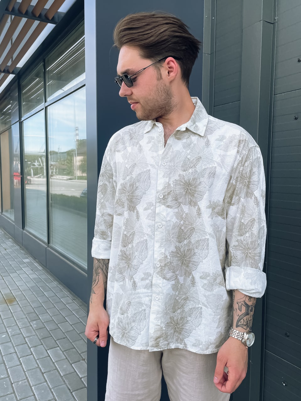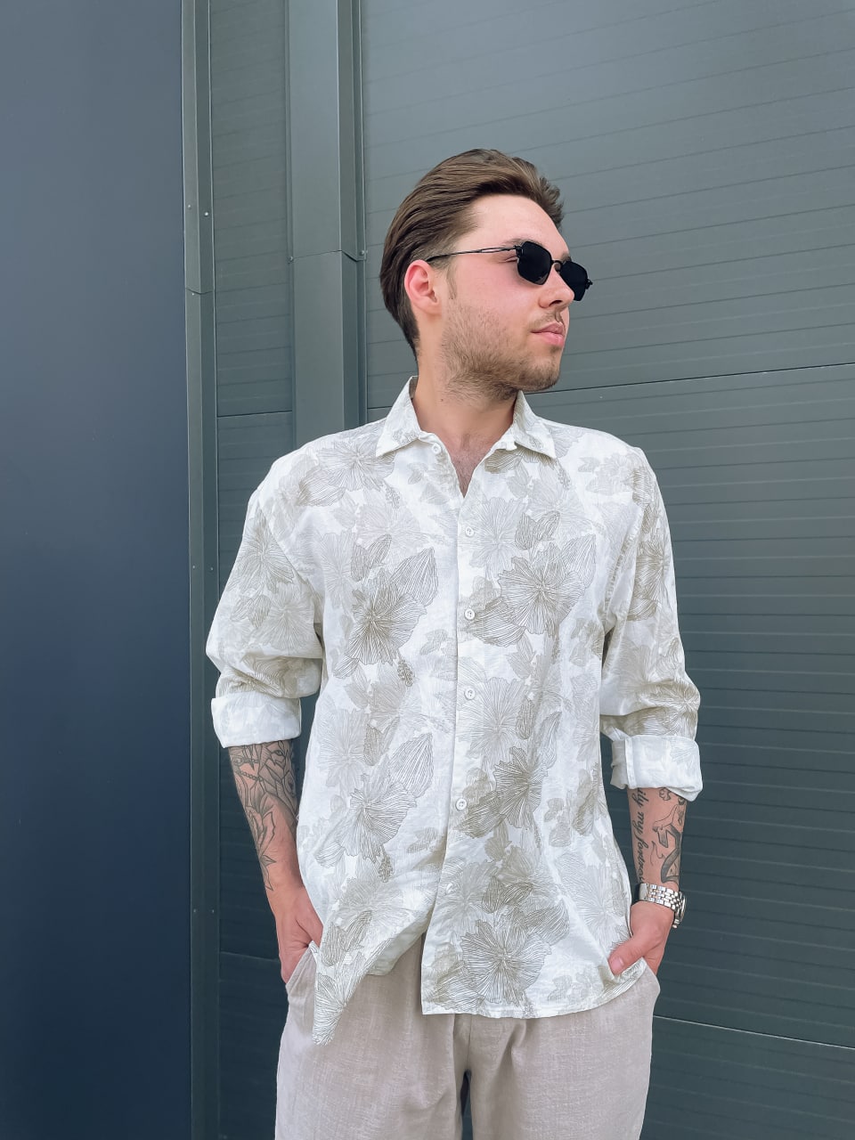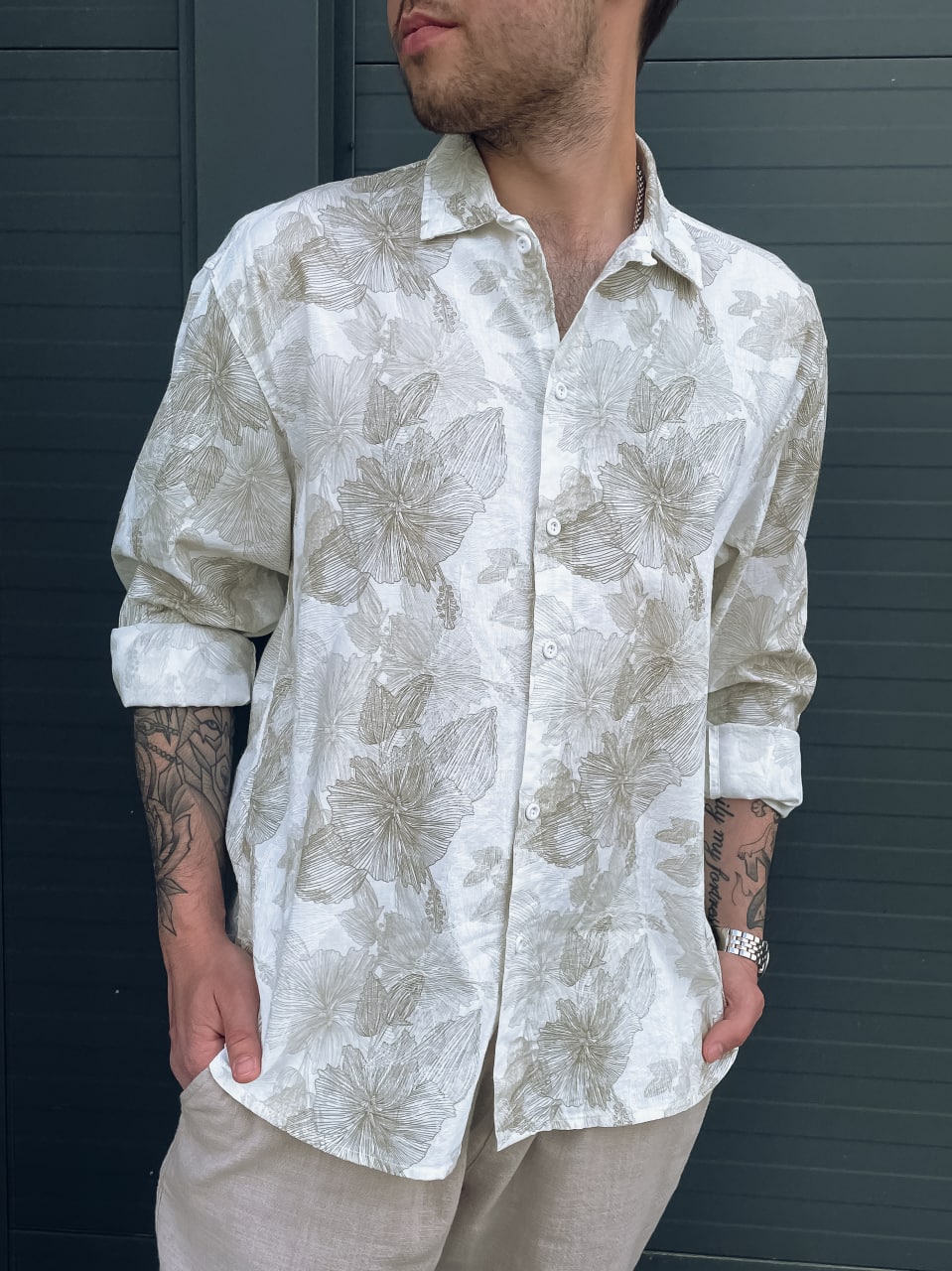 Мужская Белая Хлопковая Рубашка – Легкая Свободная в Цветочный Принт