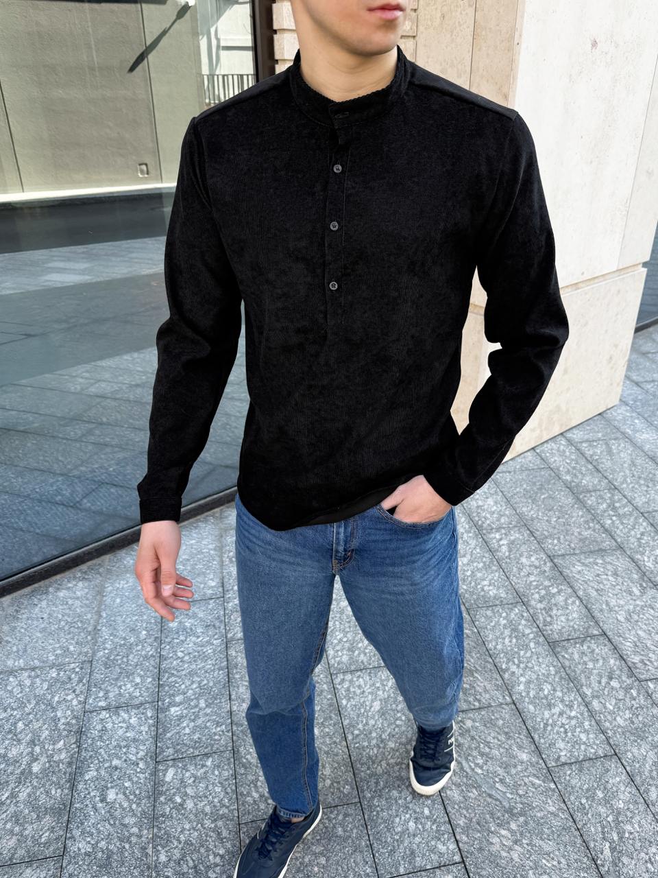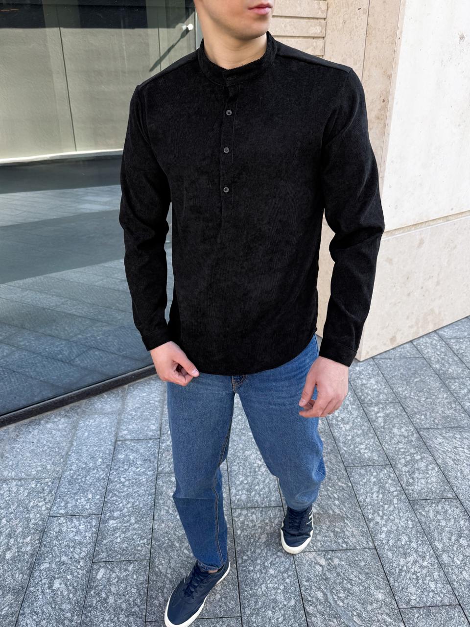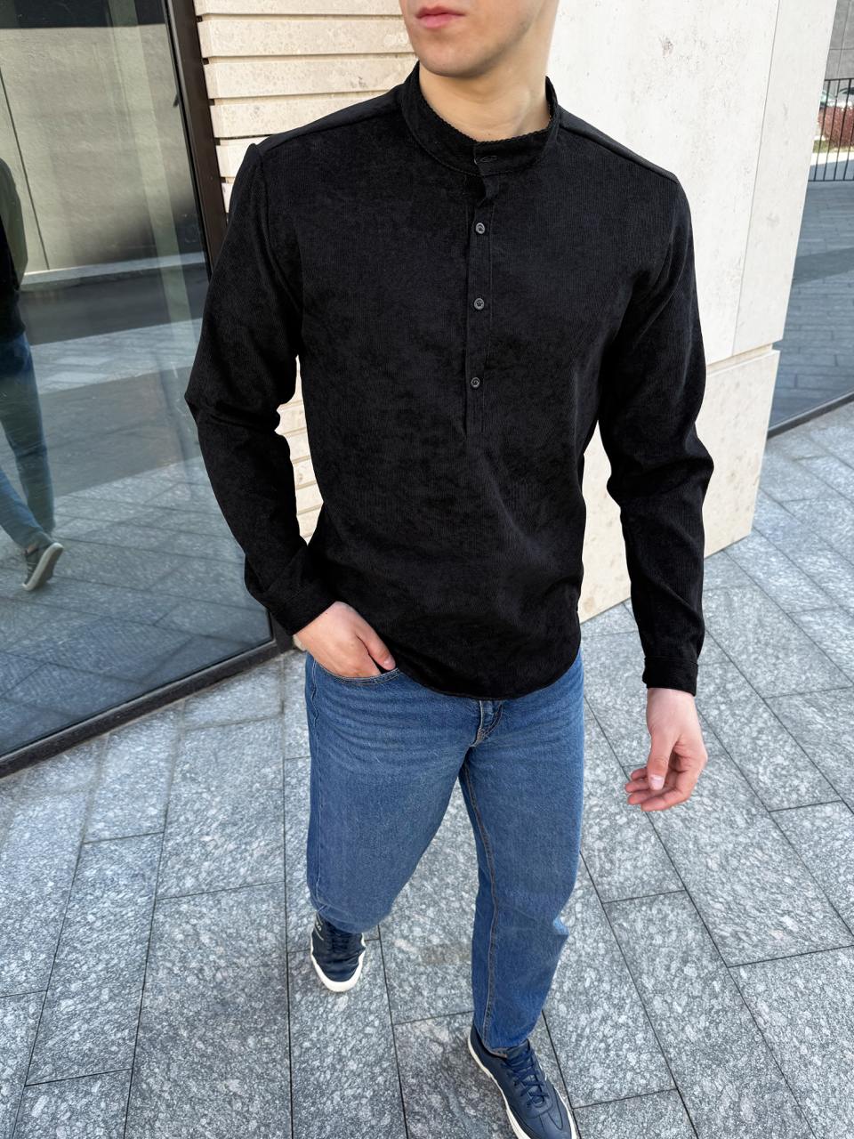 Мужская Черная Вельветовая Рубашка – Приталенная с Воротником Стойкой