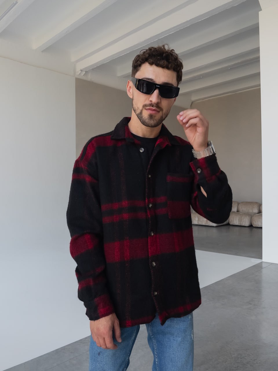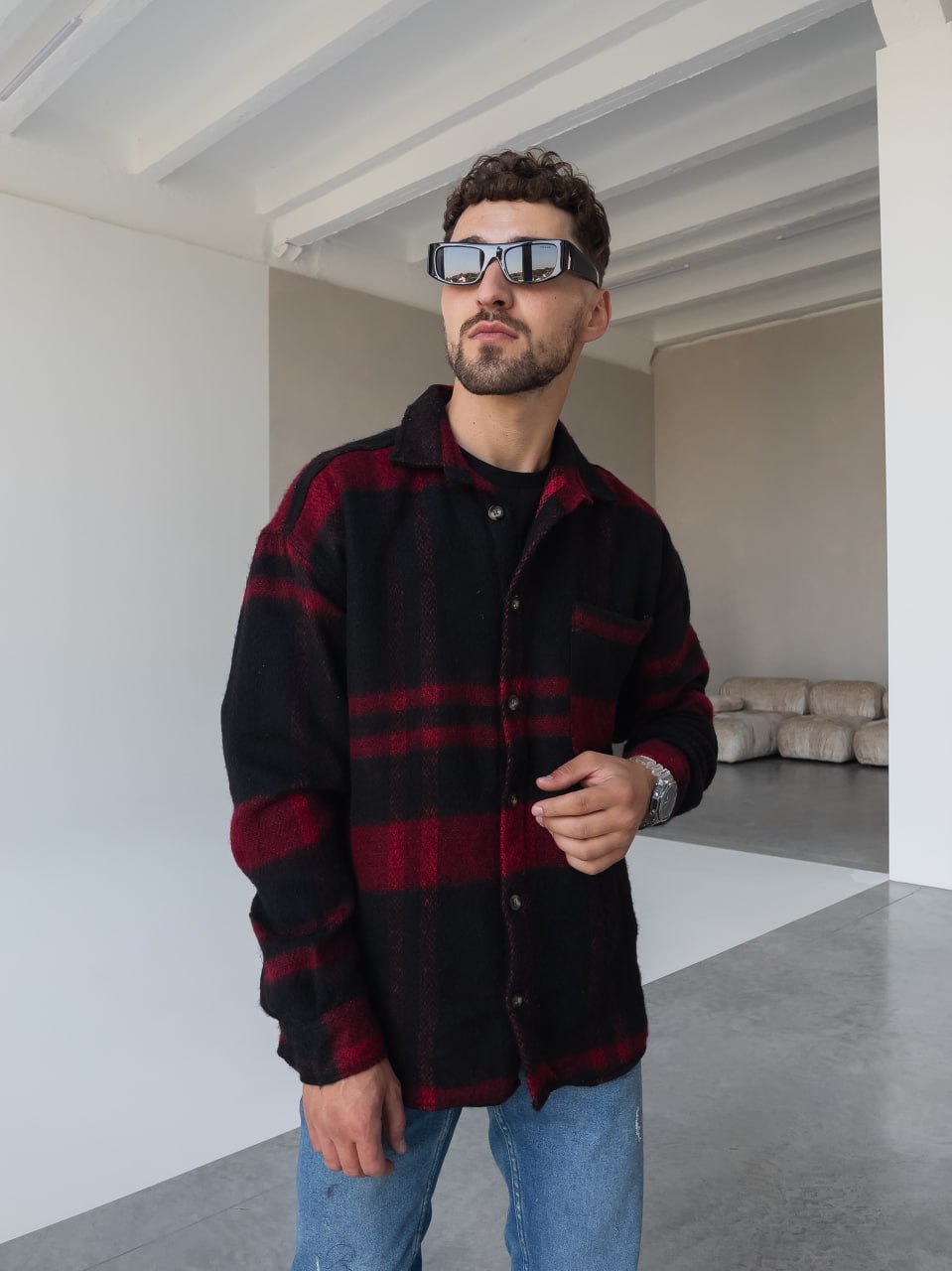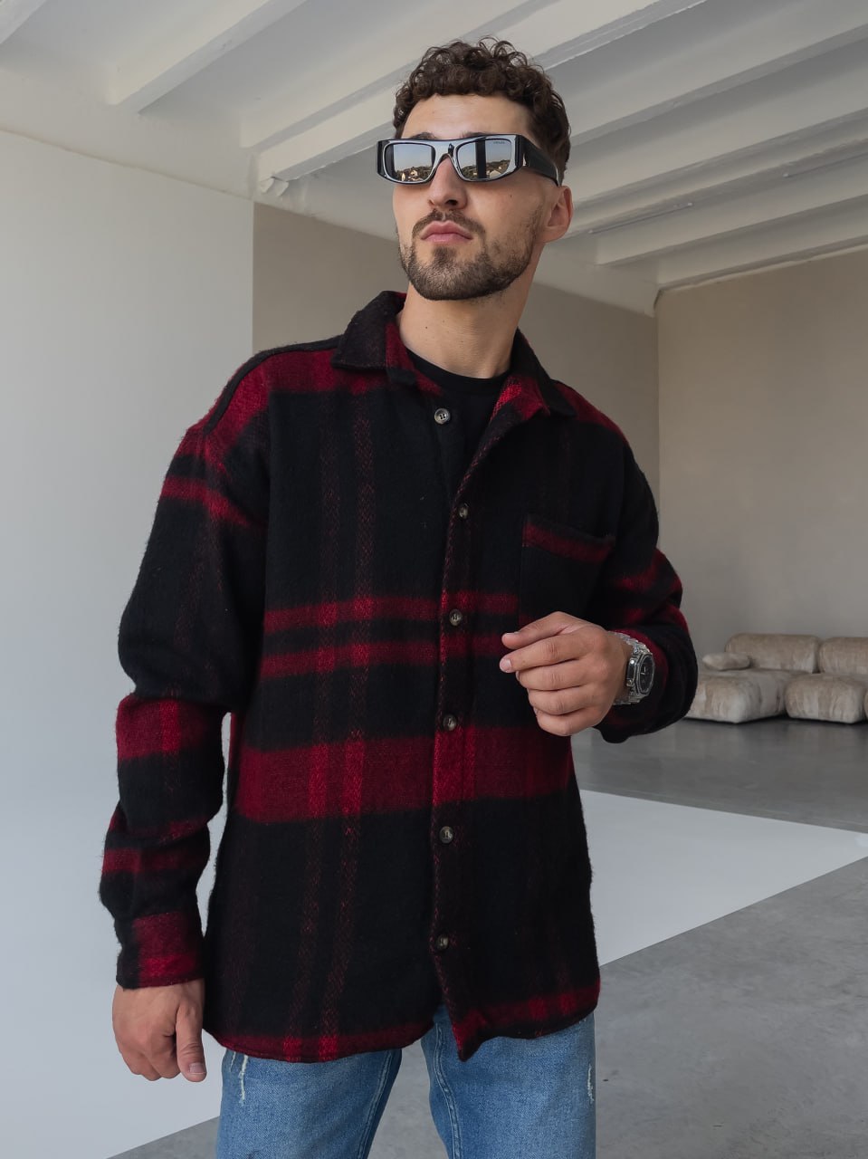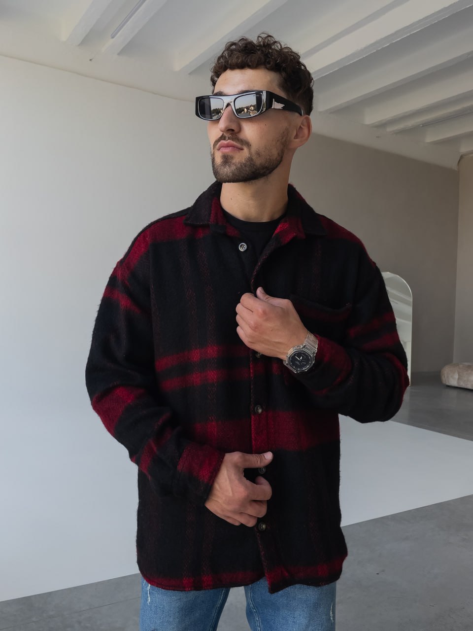 Мужская Черно-Красная Рубашка Оверсайз из Теплой Байковой Ткани
