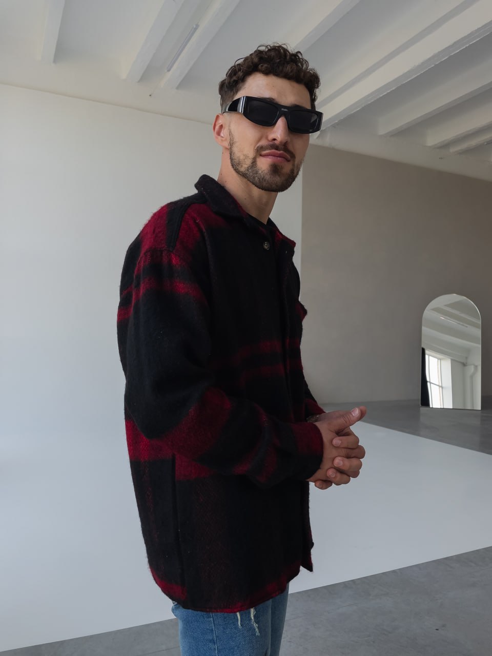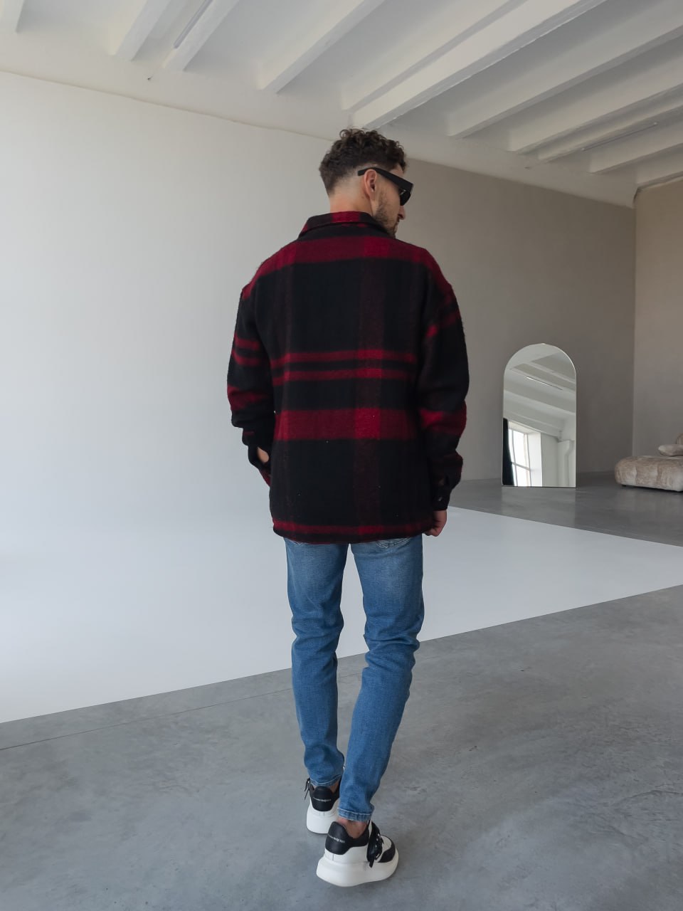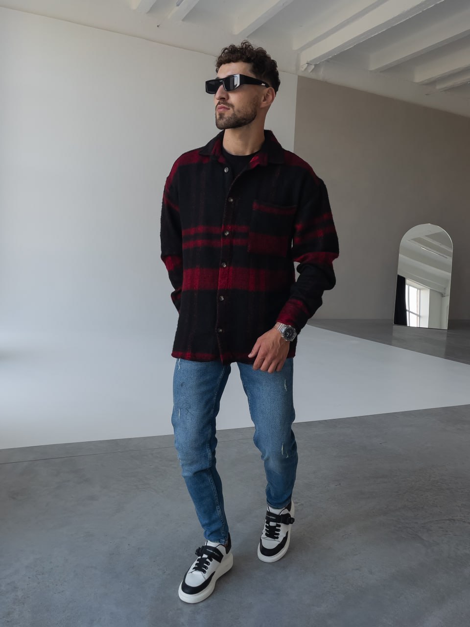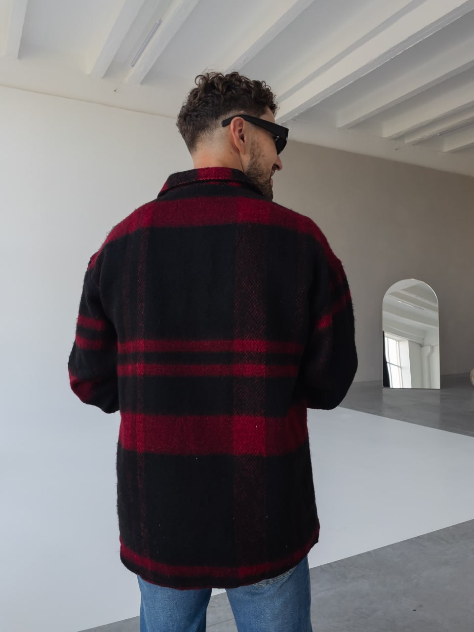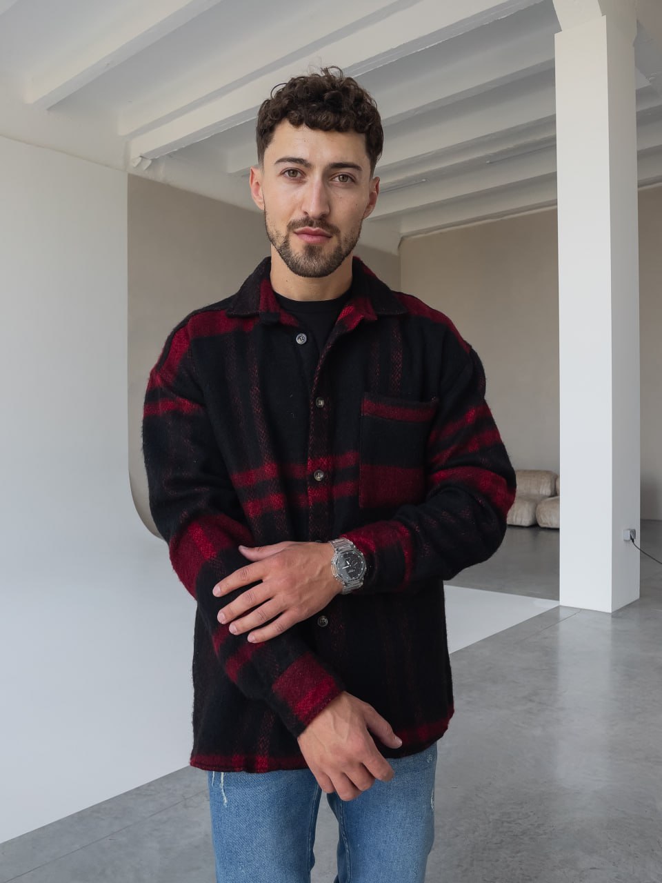 Мужская Черно-Красная Рубашка Оверсайз из Теплой Байковой Ткани