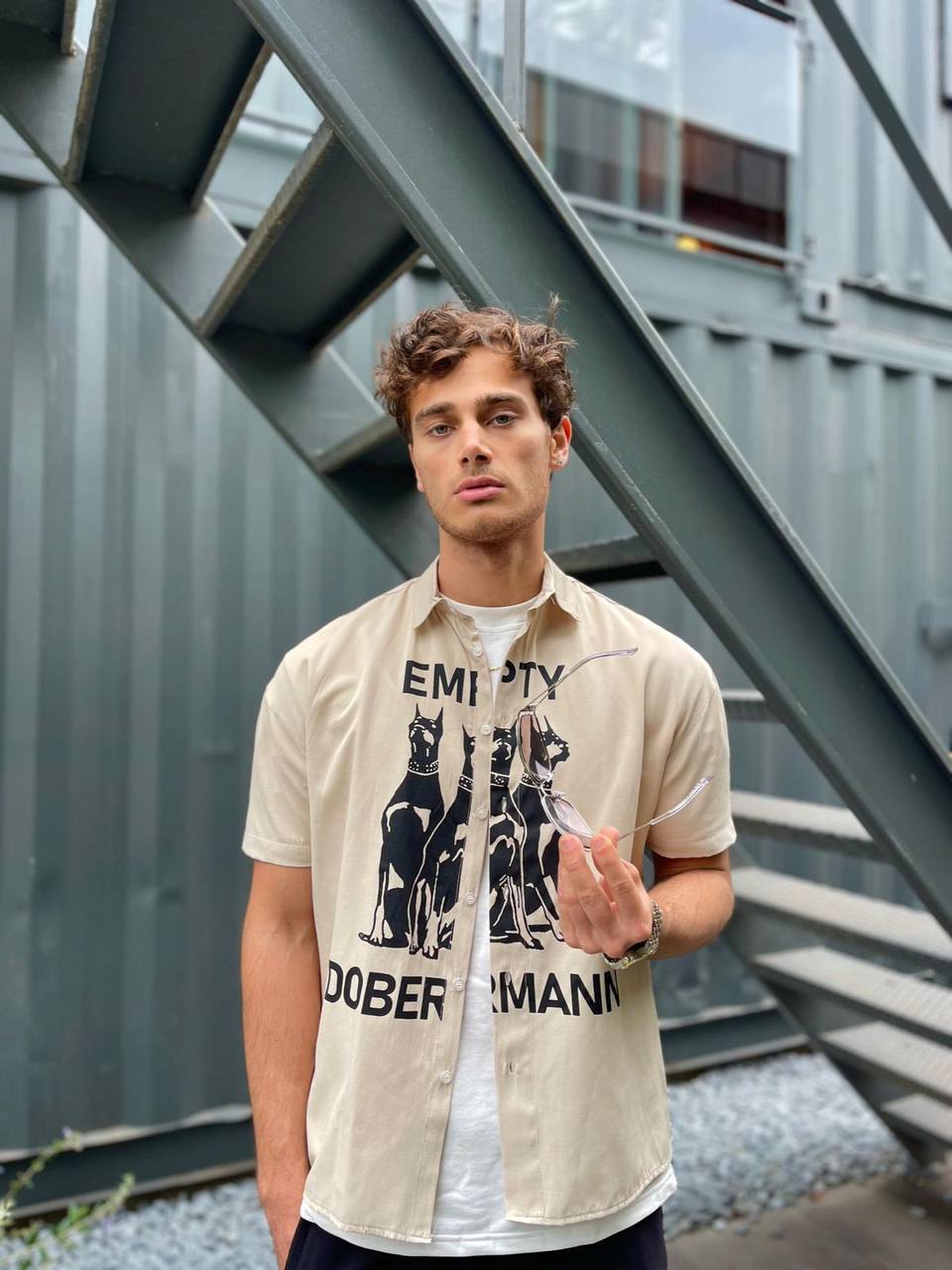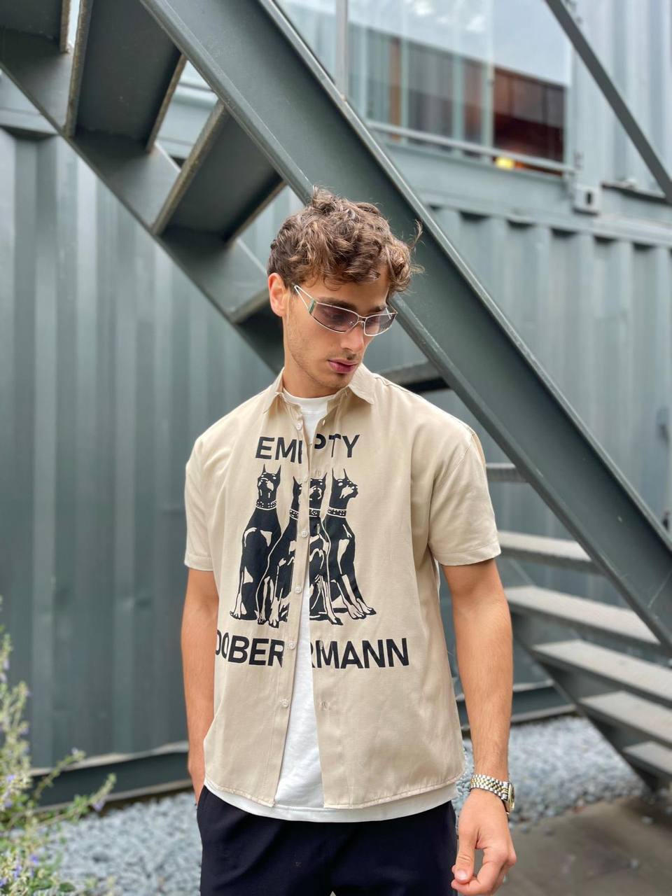 Мужская Хлопковая Бежевая Рубашка Доберман – Прямого Кроя с Короткими Рукавами