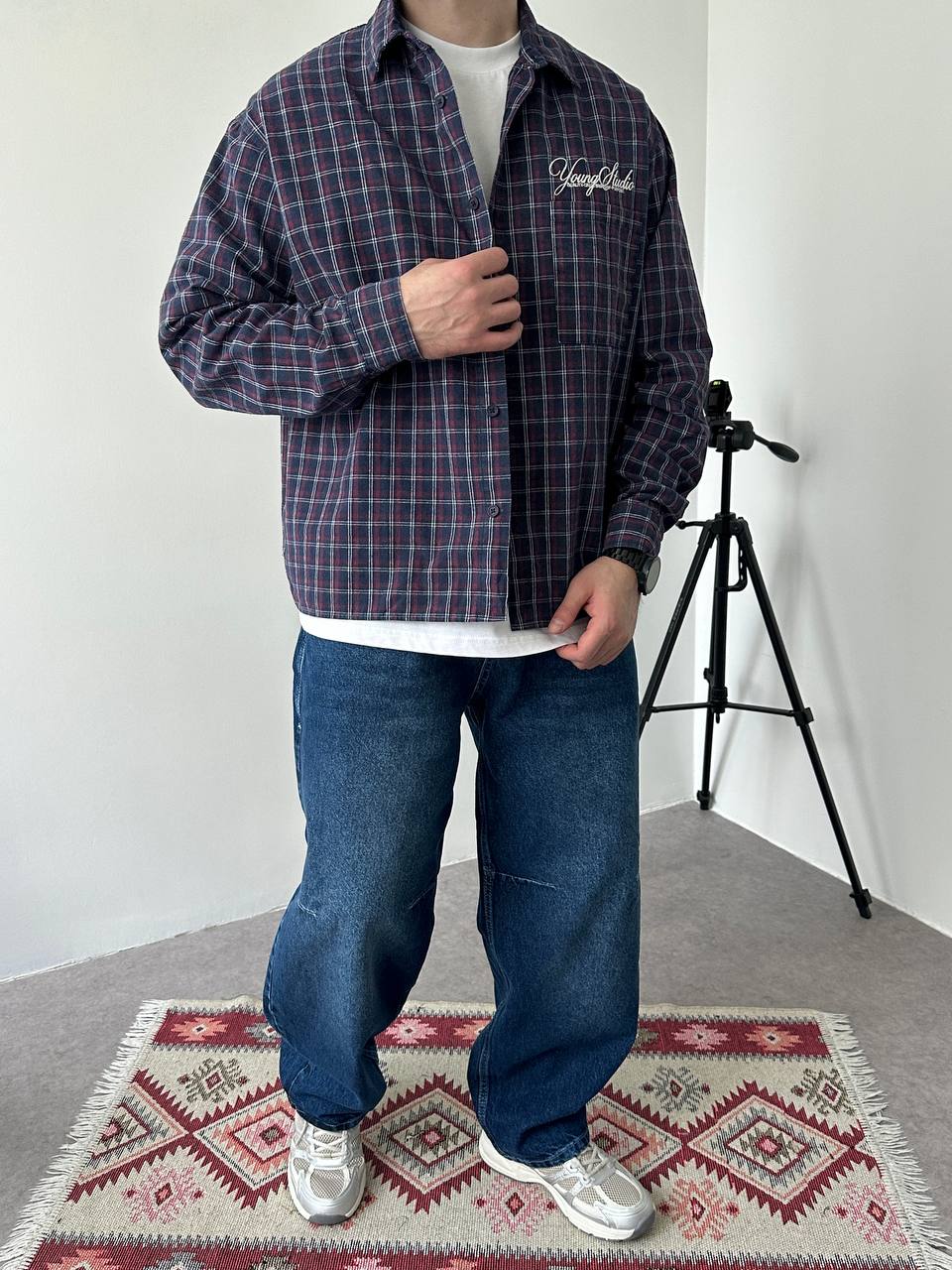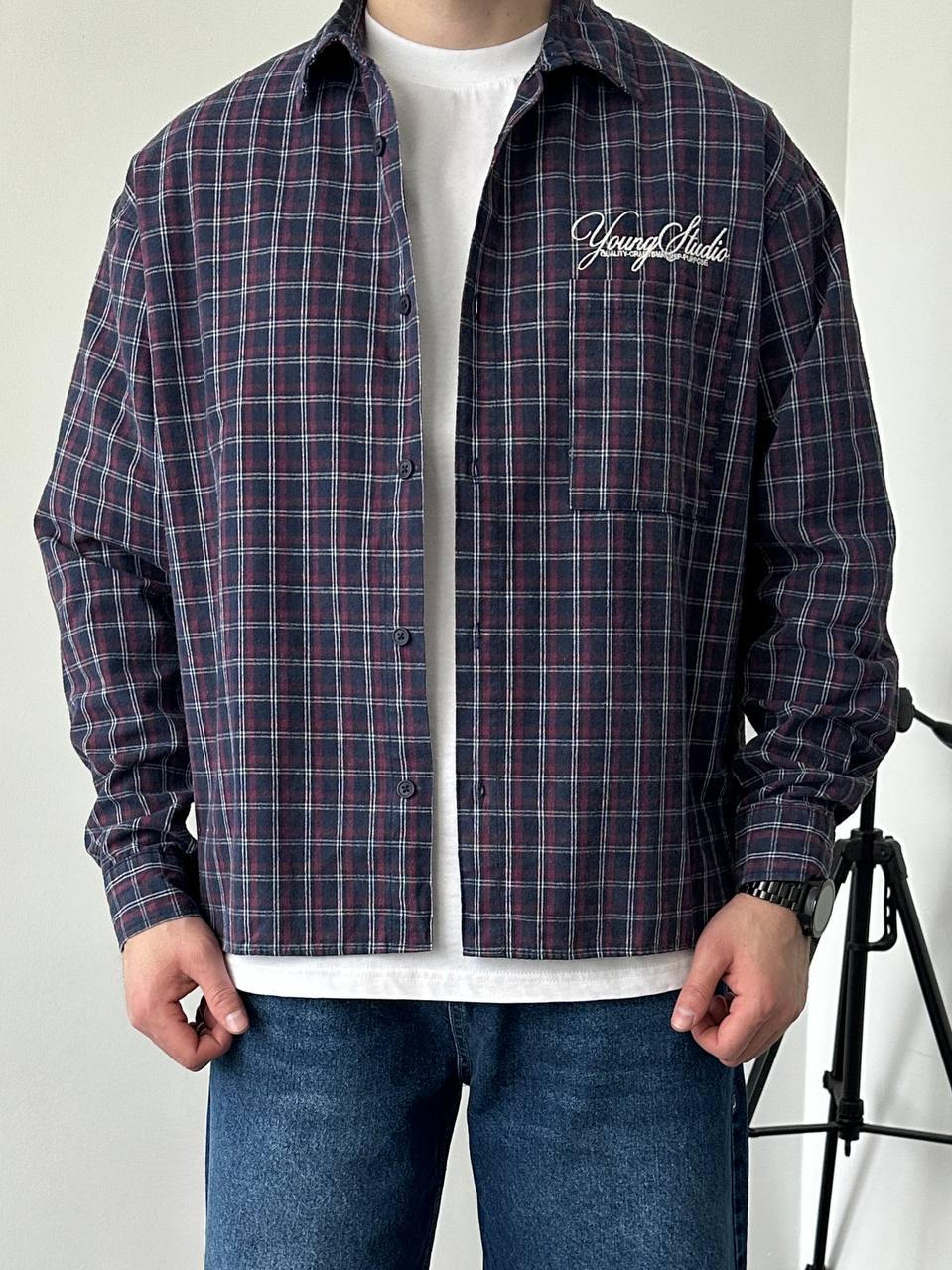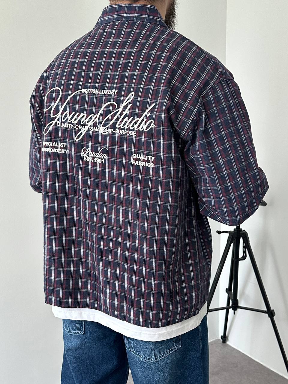 Мужская Хлопковая Клетчатая Фиолетовая Рубашка Варенка Оверсайз