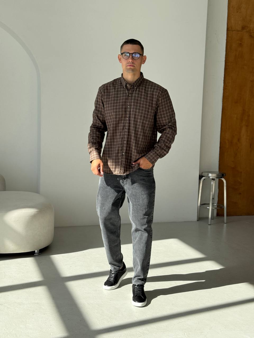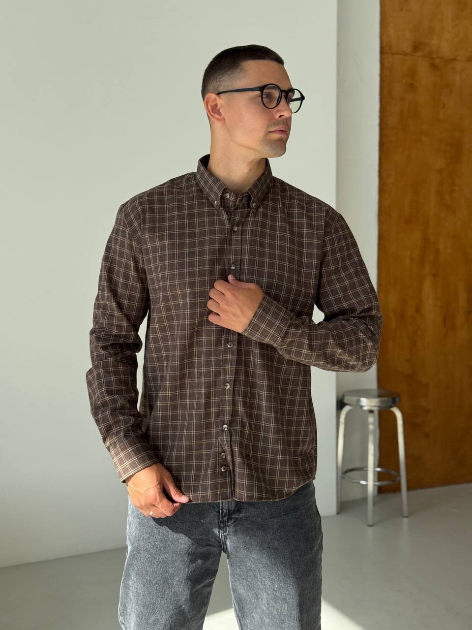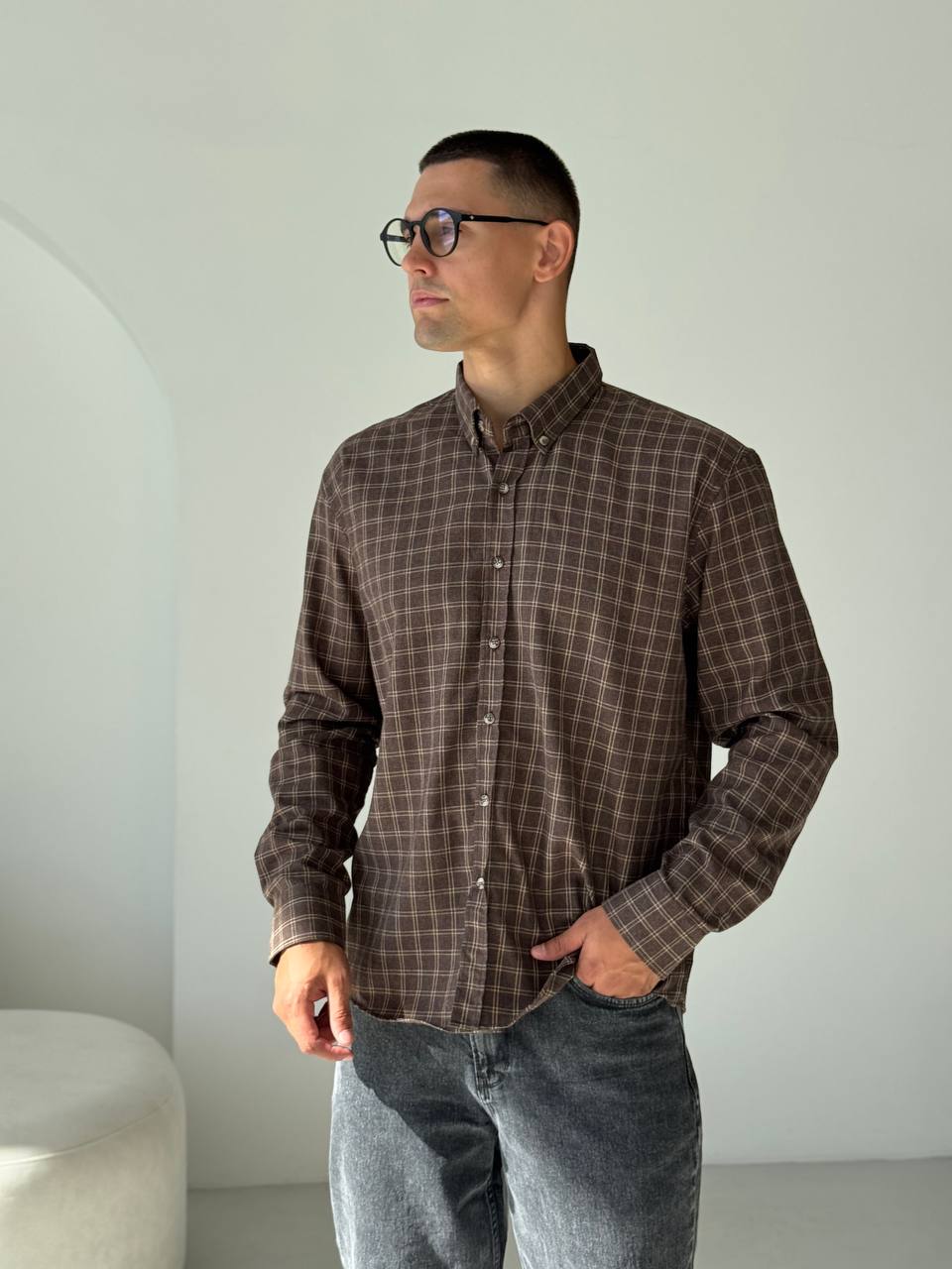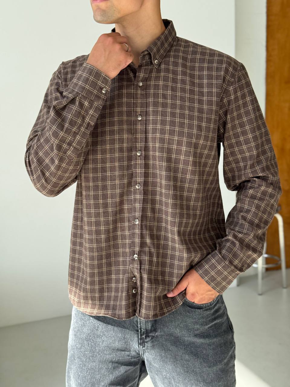Мужская Хлопковая Клетчатая Коричневая Рубашка База