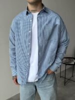 Мужская Хлопковая Синяя Рубашка Свободного Кроя в Мелкую Клеточку