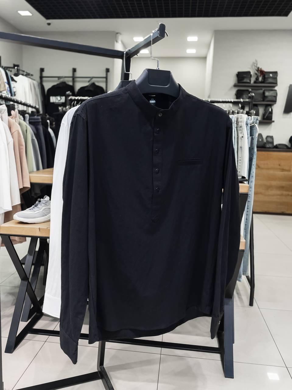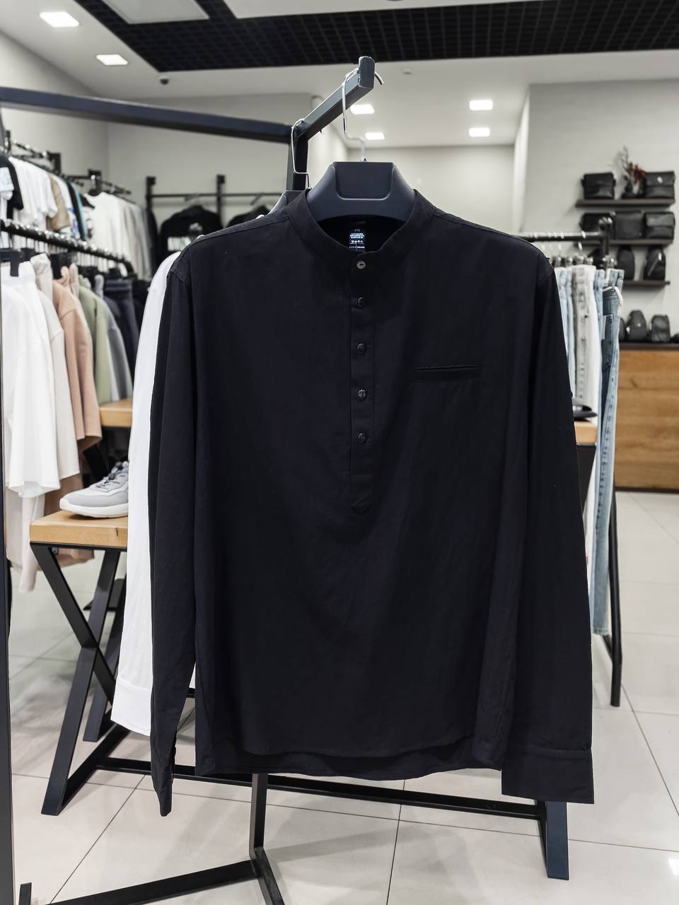 Мужская Классическая Хлопковая Черная Рубашка с Воротником Стойкой