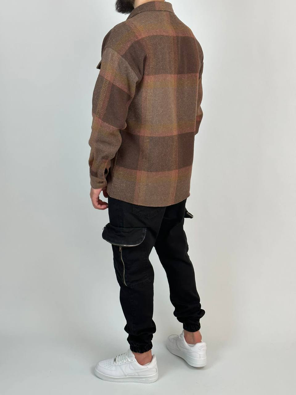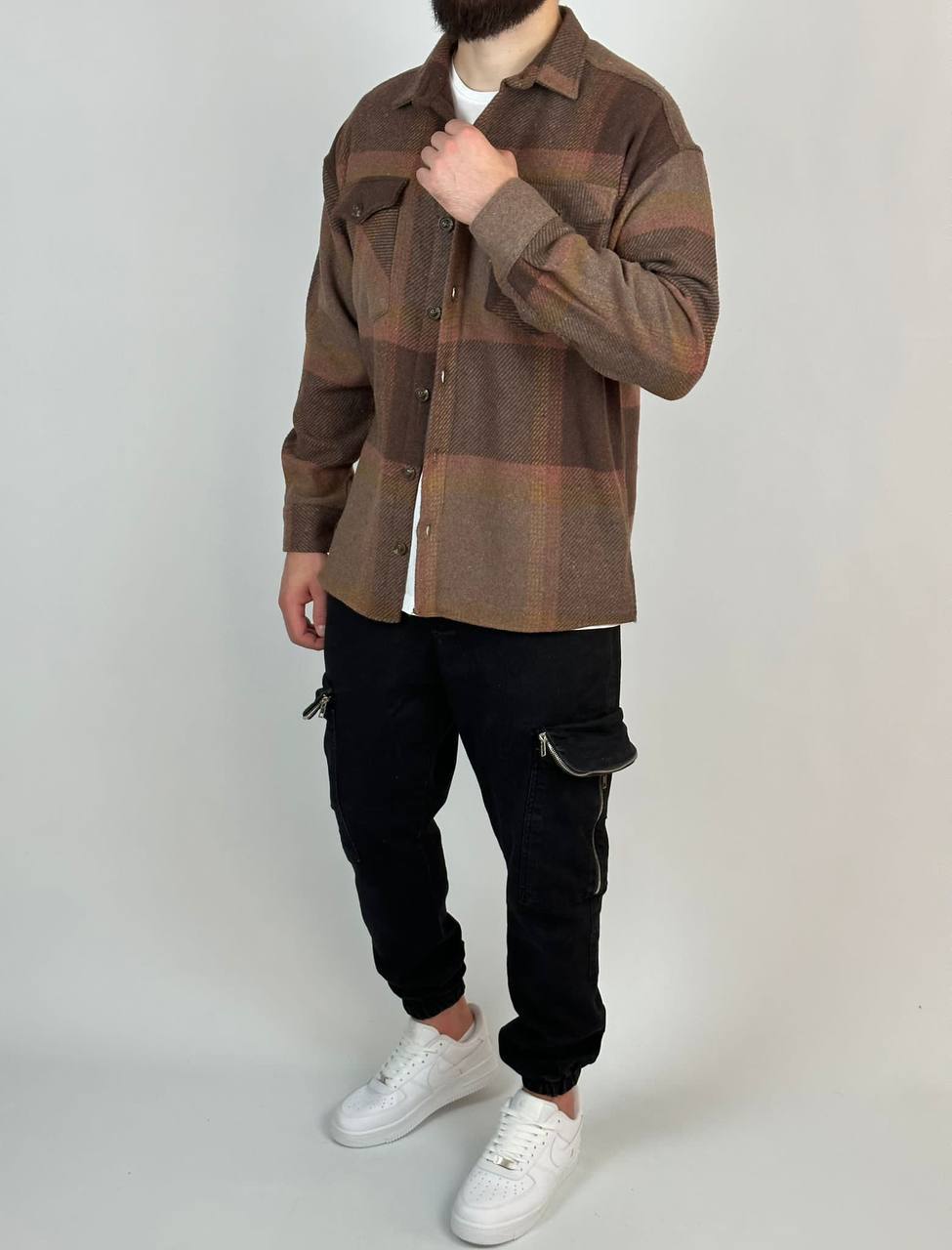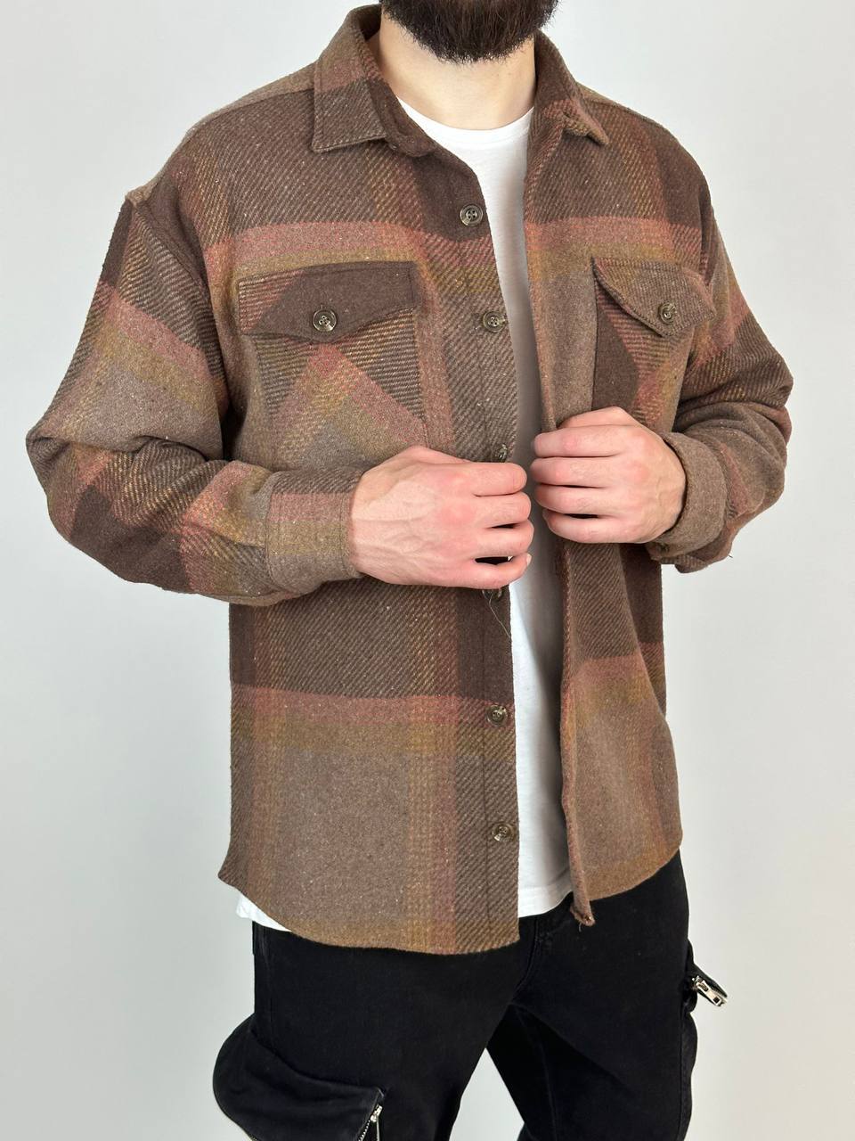 Мужская Клетчатая Коричневая Рубашка Оверсайз из Теплой Байковой Ткани