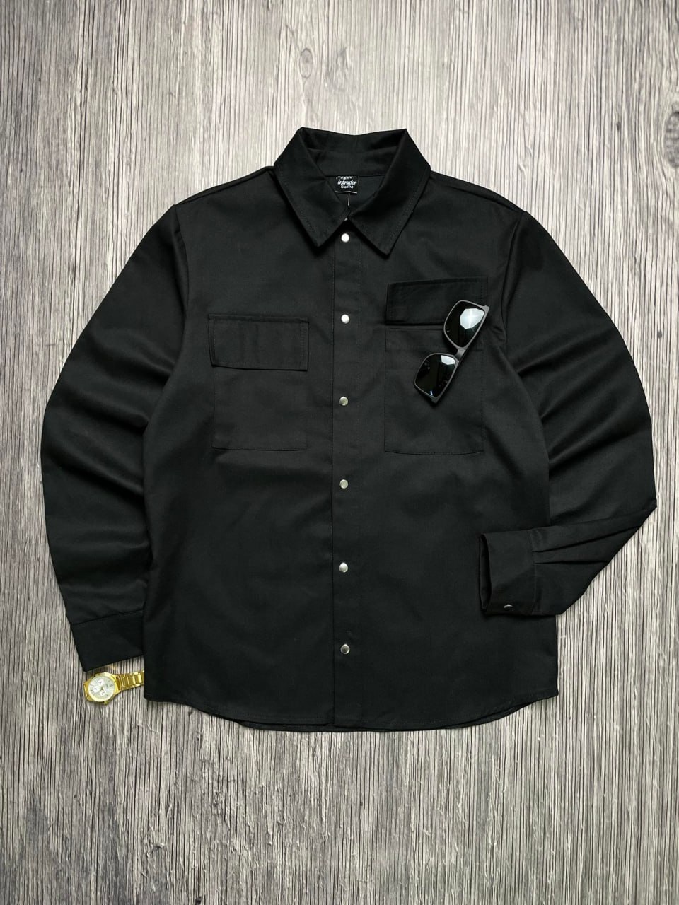 Мужская Коттоновая Черная Рубашка Прямого Кроя на Кнопках Заклепках