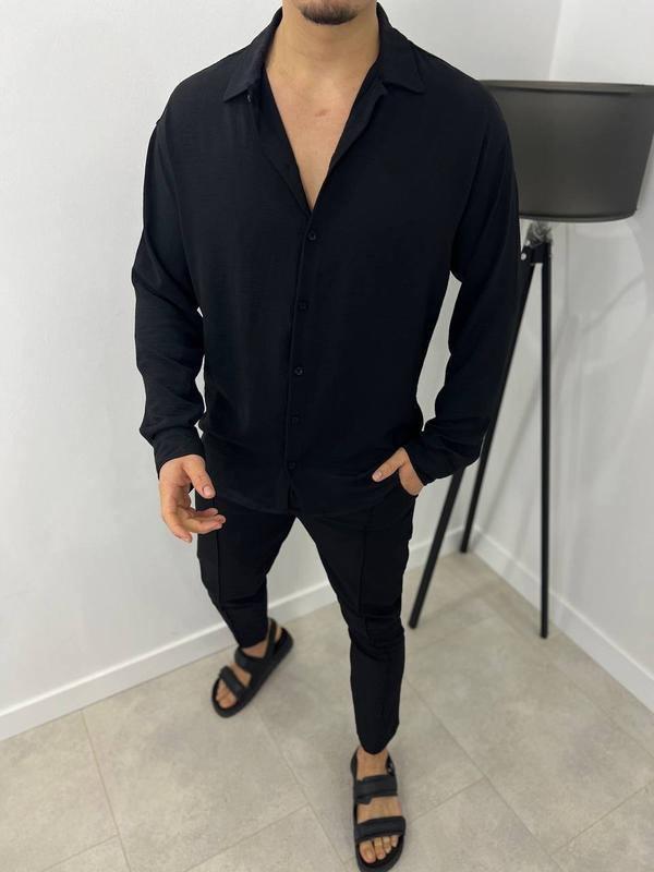 Мужская Легкая Летняя Черная Рубашка Свободного Кроя Лен Жатка