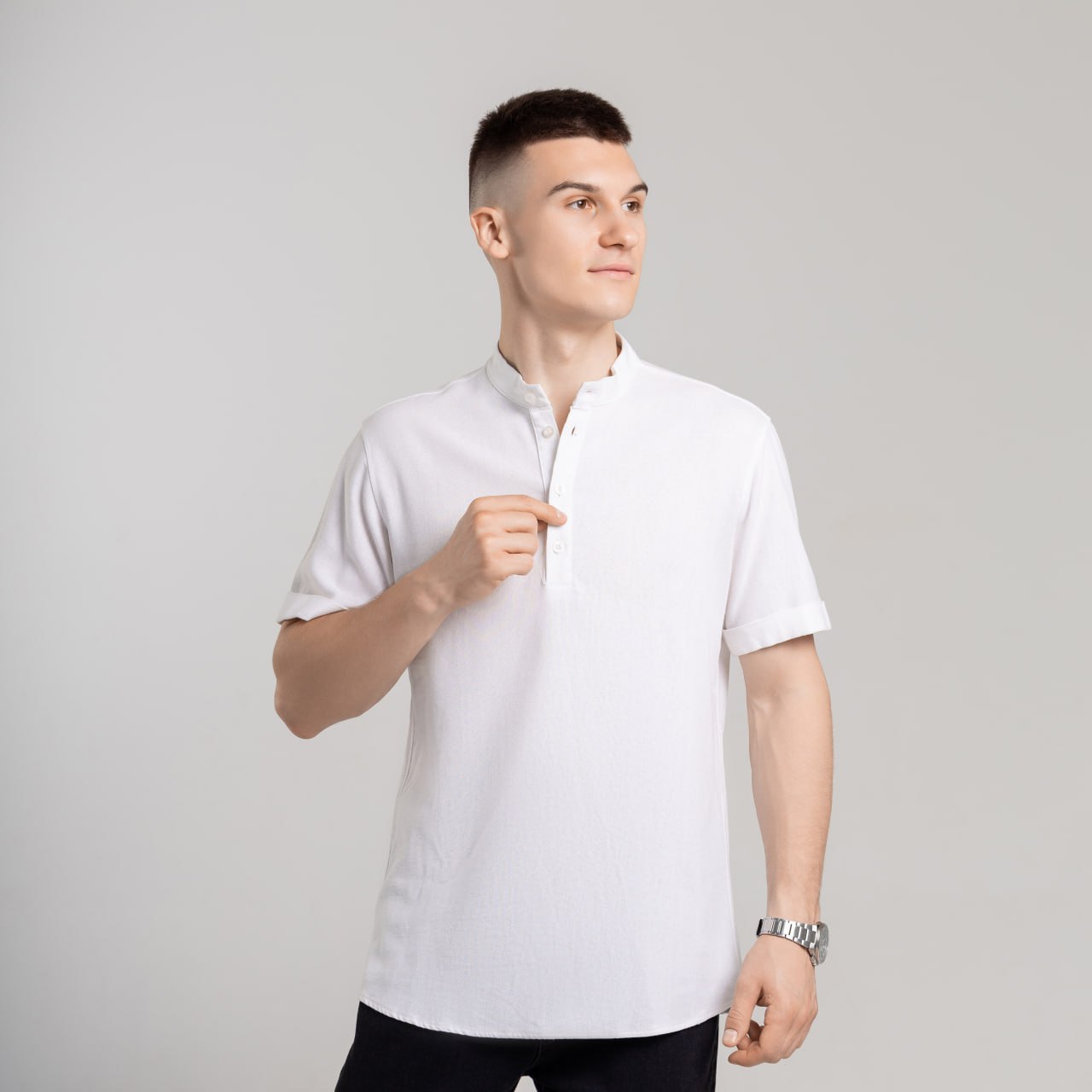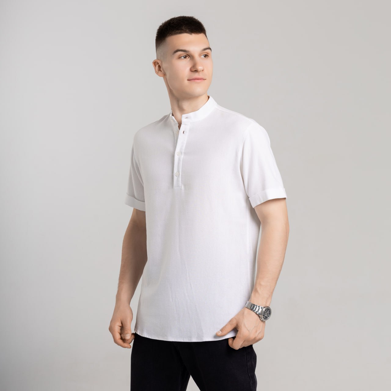 Мужская Летняя Базовая Белая Рубашка с Воротником Стойкой и Коротким Рукавом