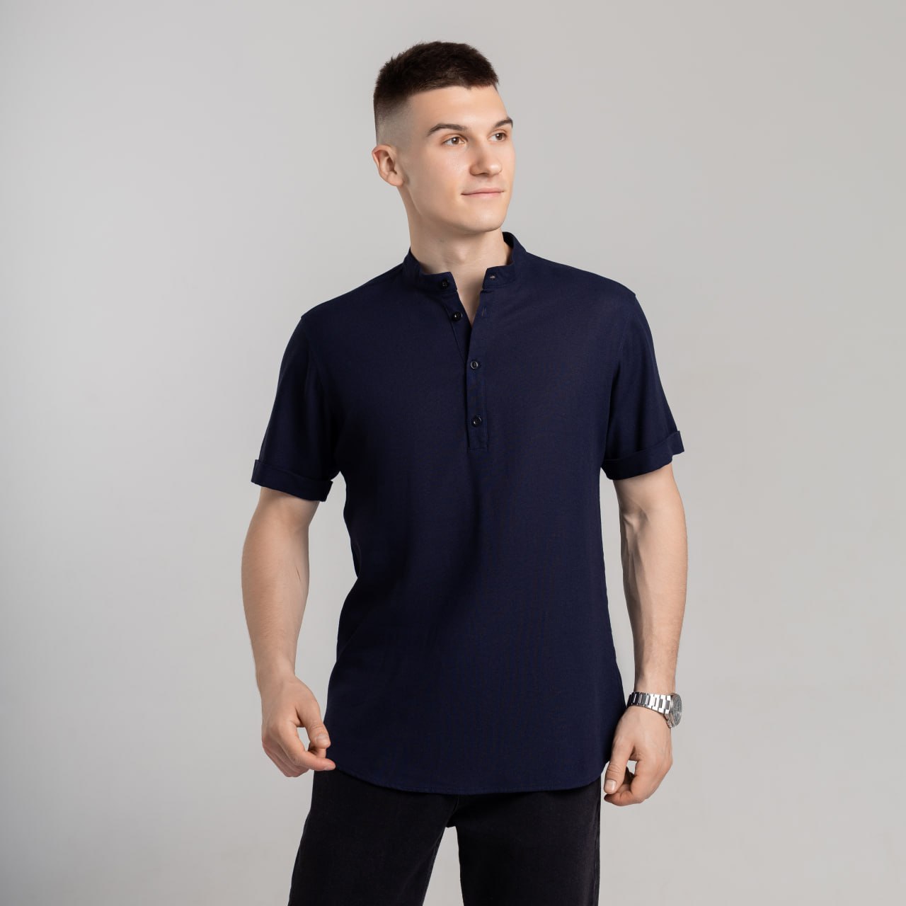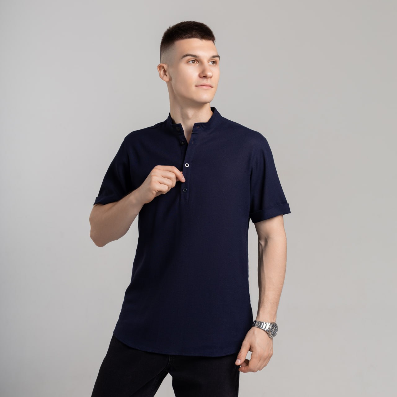Мужская Летняя Базовая Темно-Синяя Рубашка с Воротником Стойкой и Коротким Рукавом