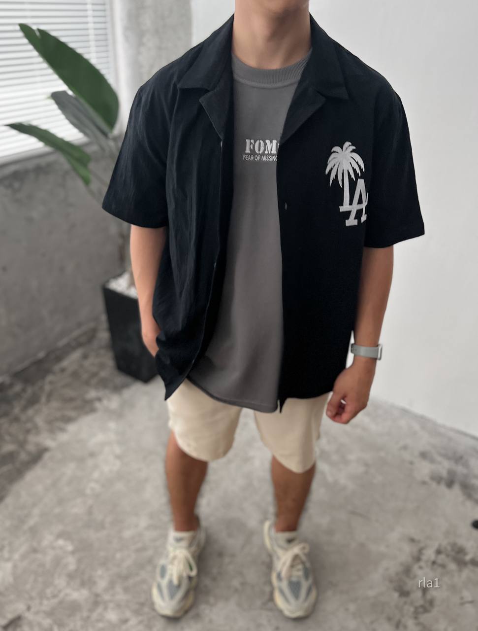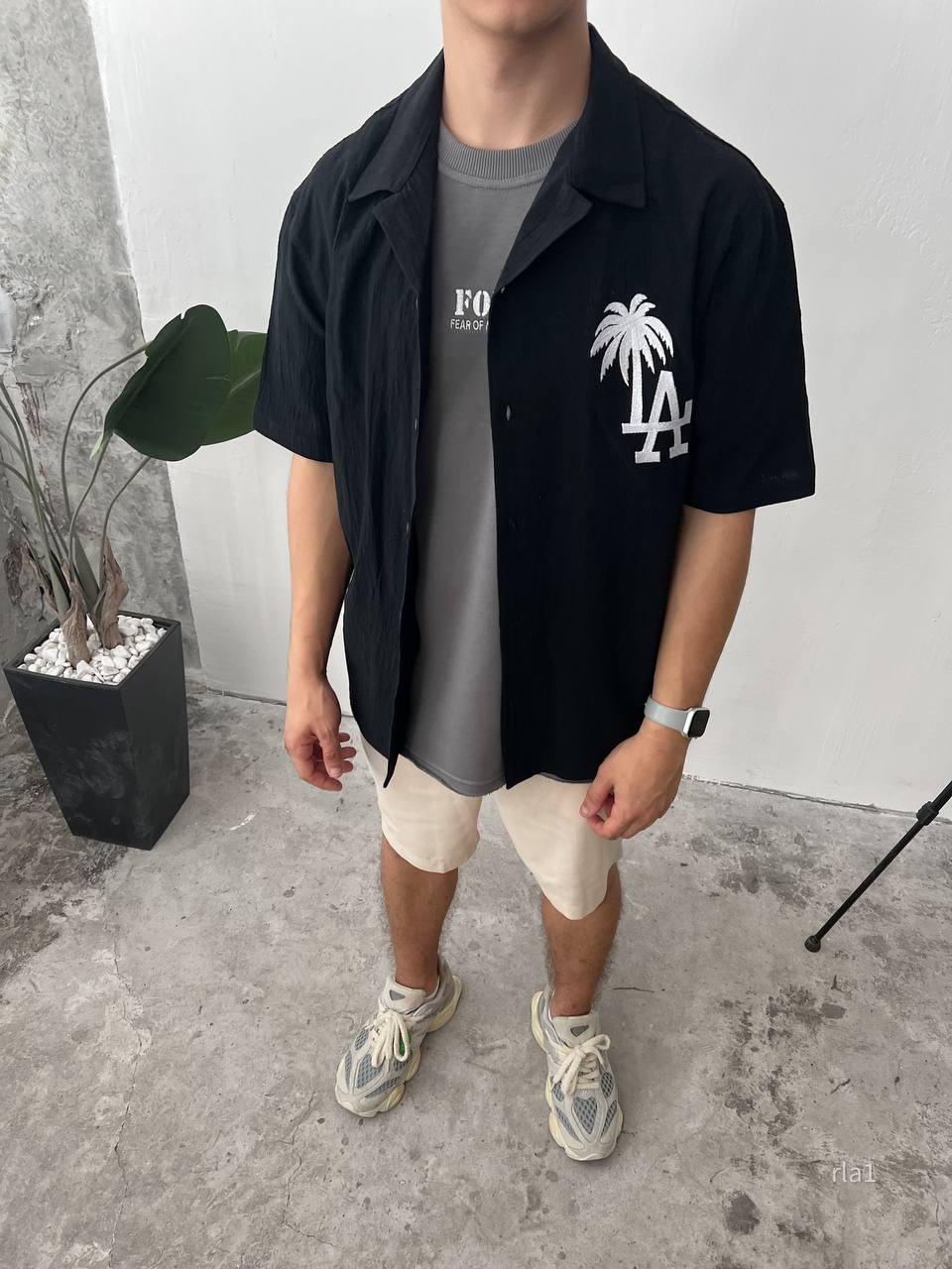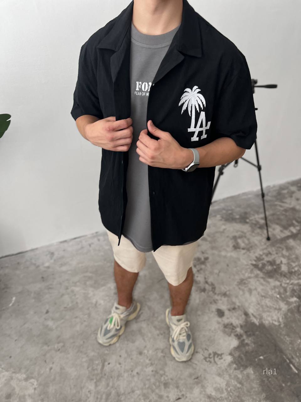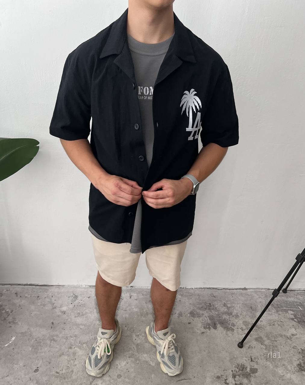Мужская Летняя Черная Рубашка Лен Свободного Кроя с Короткими Рукавами