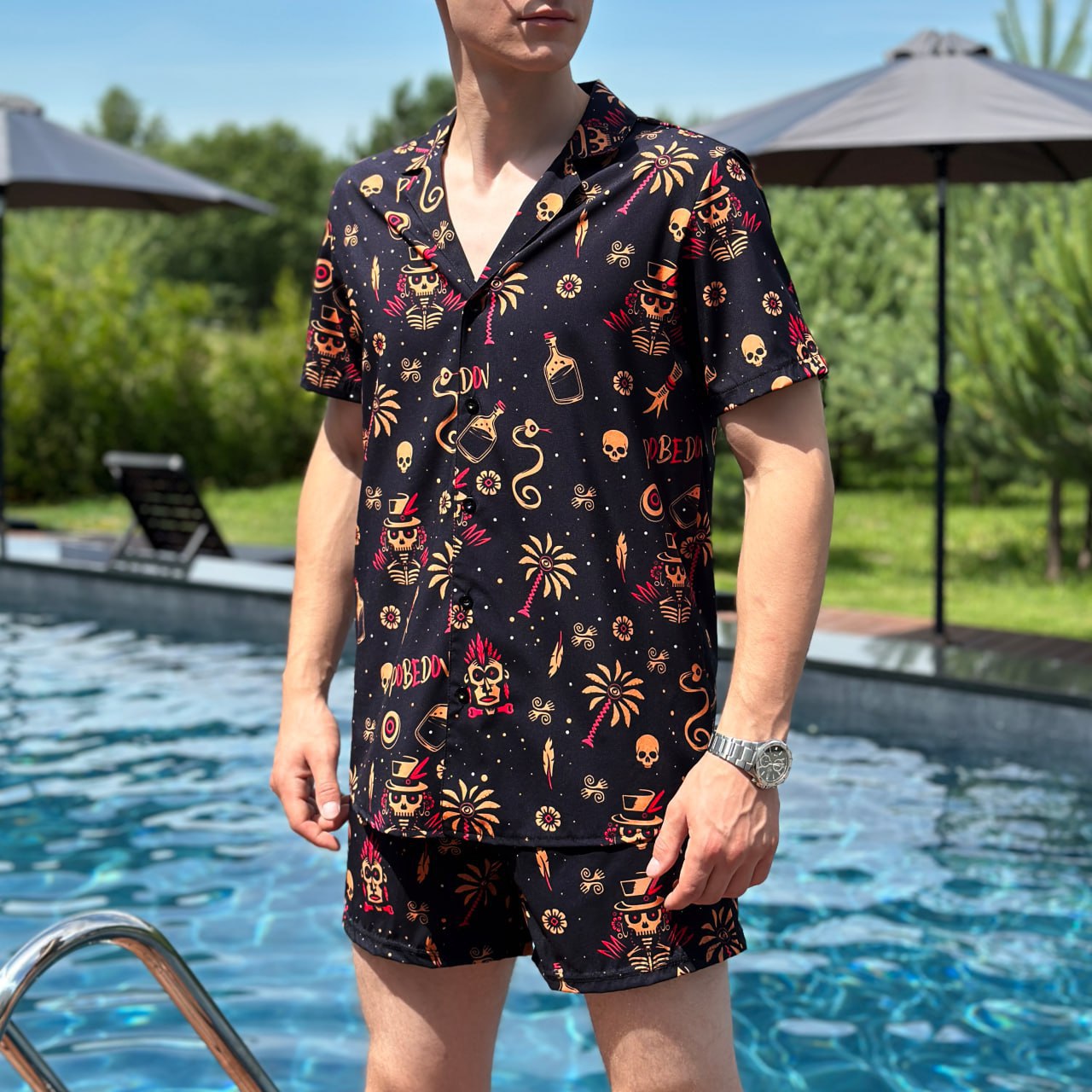 Мужская Летняя Черная Рубашка с Короткими Рукавами в Мексиканский Принт