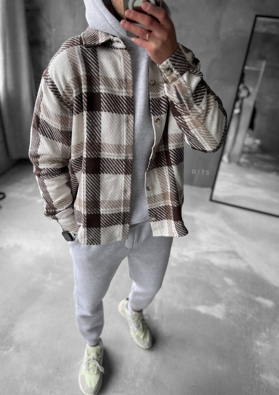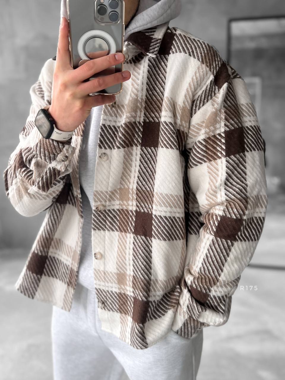 Мужская Теплая Байковая Коричнево-Белая Рубашка Клетчатая Свободного Кроя