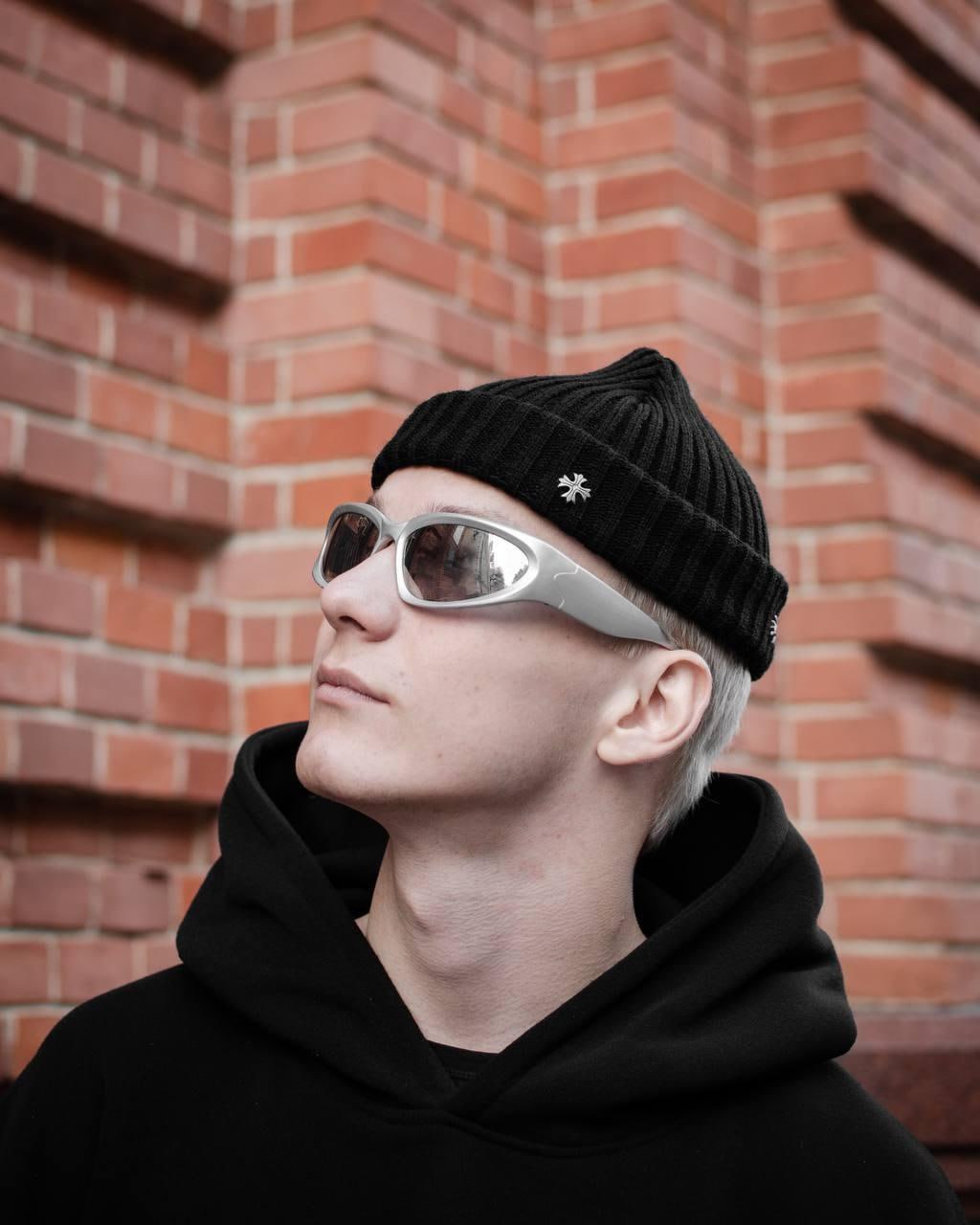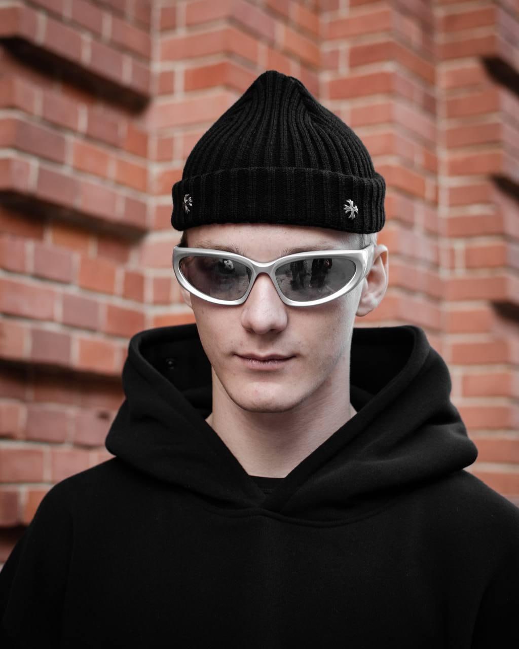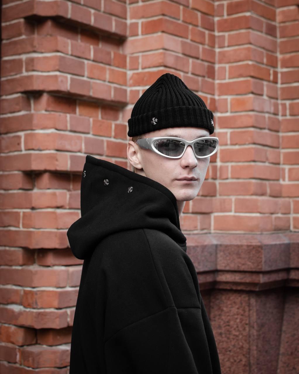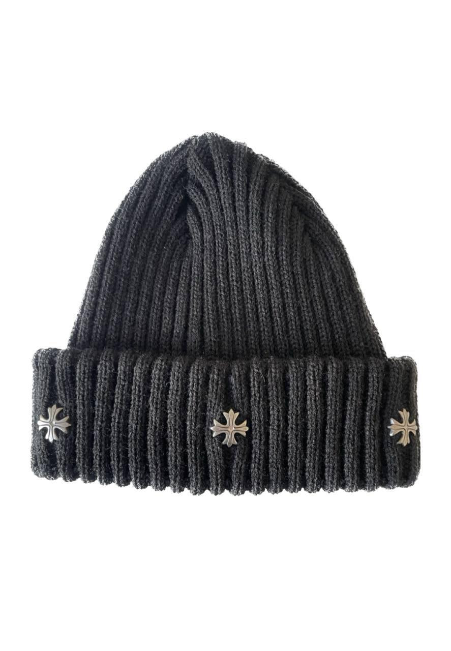 Мужская Черная Шапка Бини с Пришитыми Металлическими Крестами
