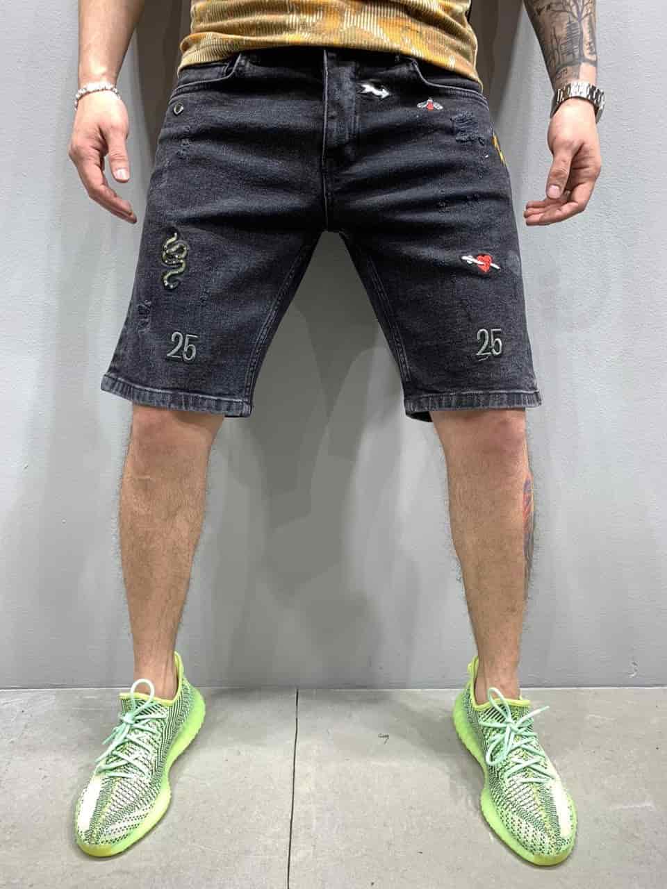 Мужские Джинсовые Шорты Черные – Потертые с Вышивками Нашивками
