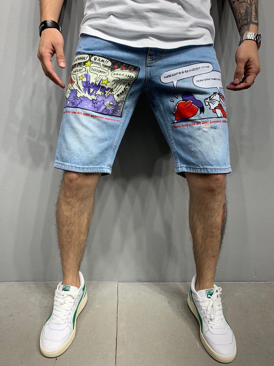 Мужские Джинсовые Шорты Голубые – Свободного Кроя Летние с Ярким Принтом
