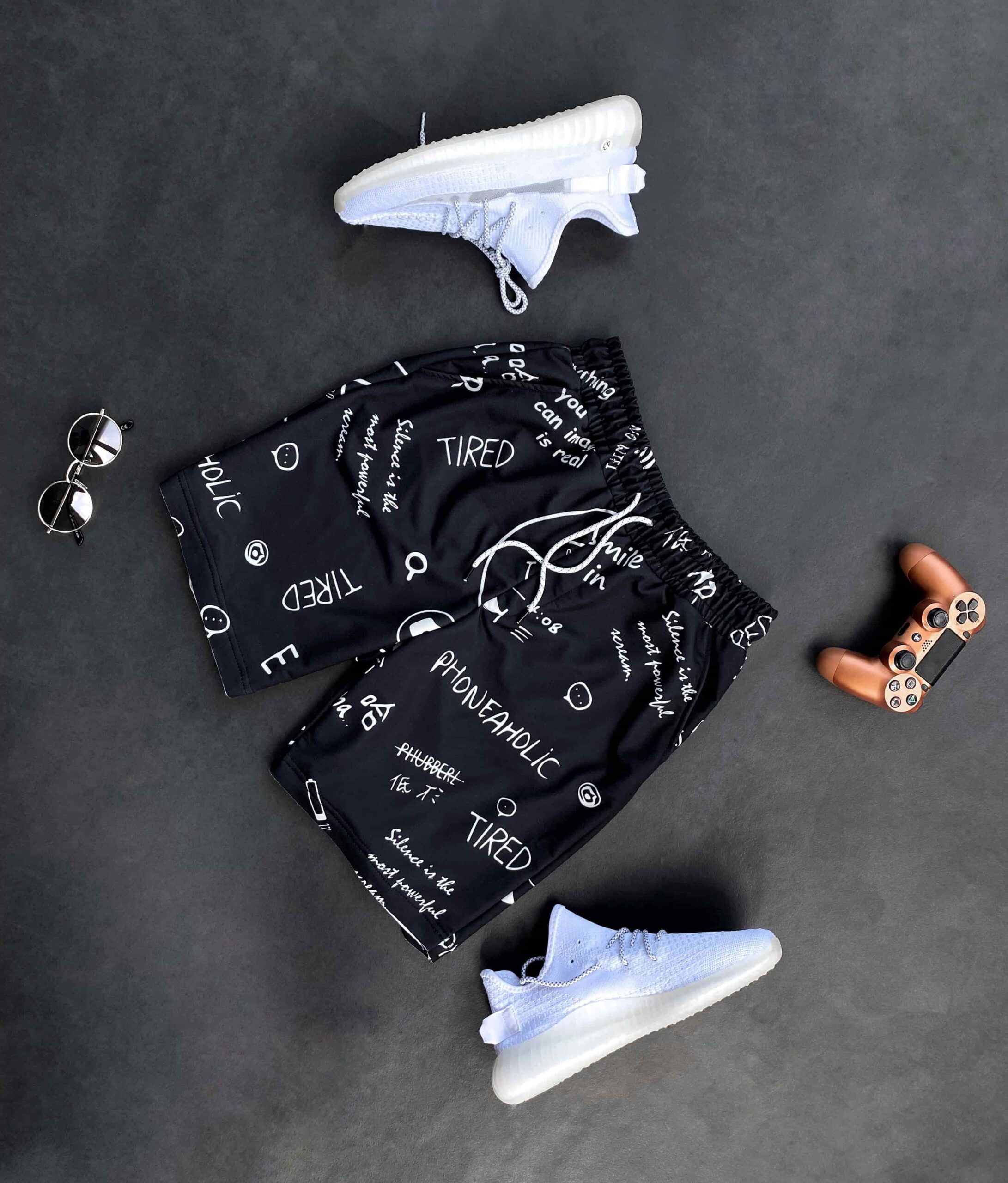 Мужские Летние Шорты Черные – Свободные Коттон с Рисунком и Надписями