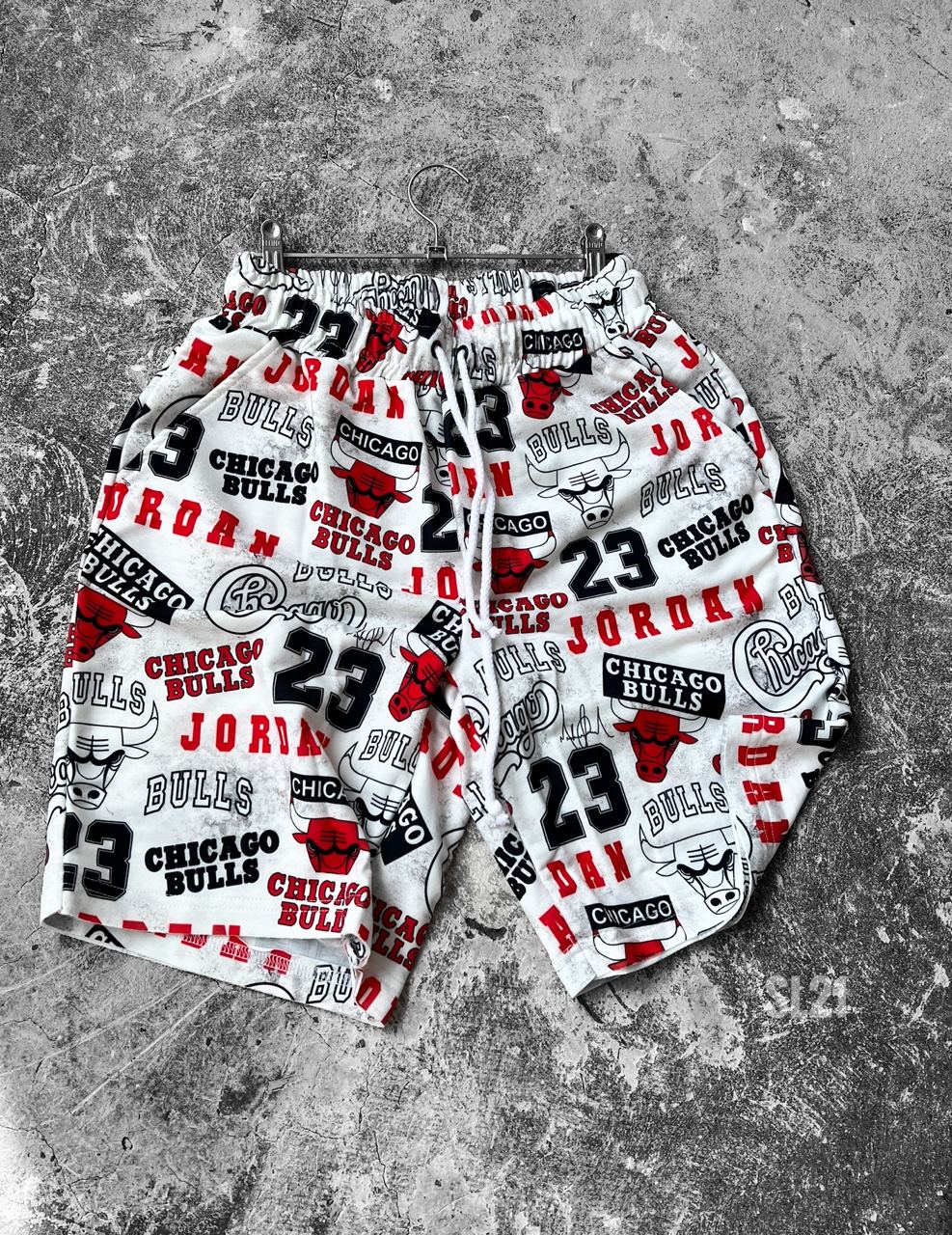 Мужские Летние Трикотажные Шорты Белые с Принтами “Chikago Bulls – Jordan”