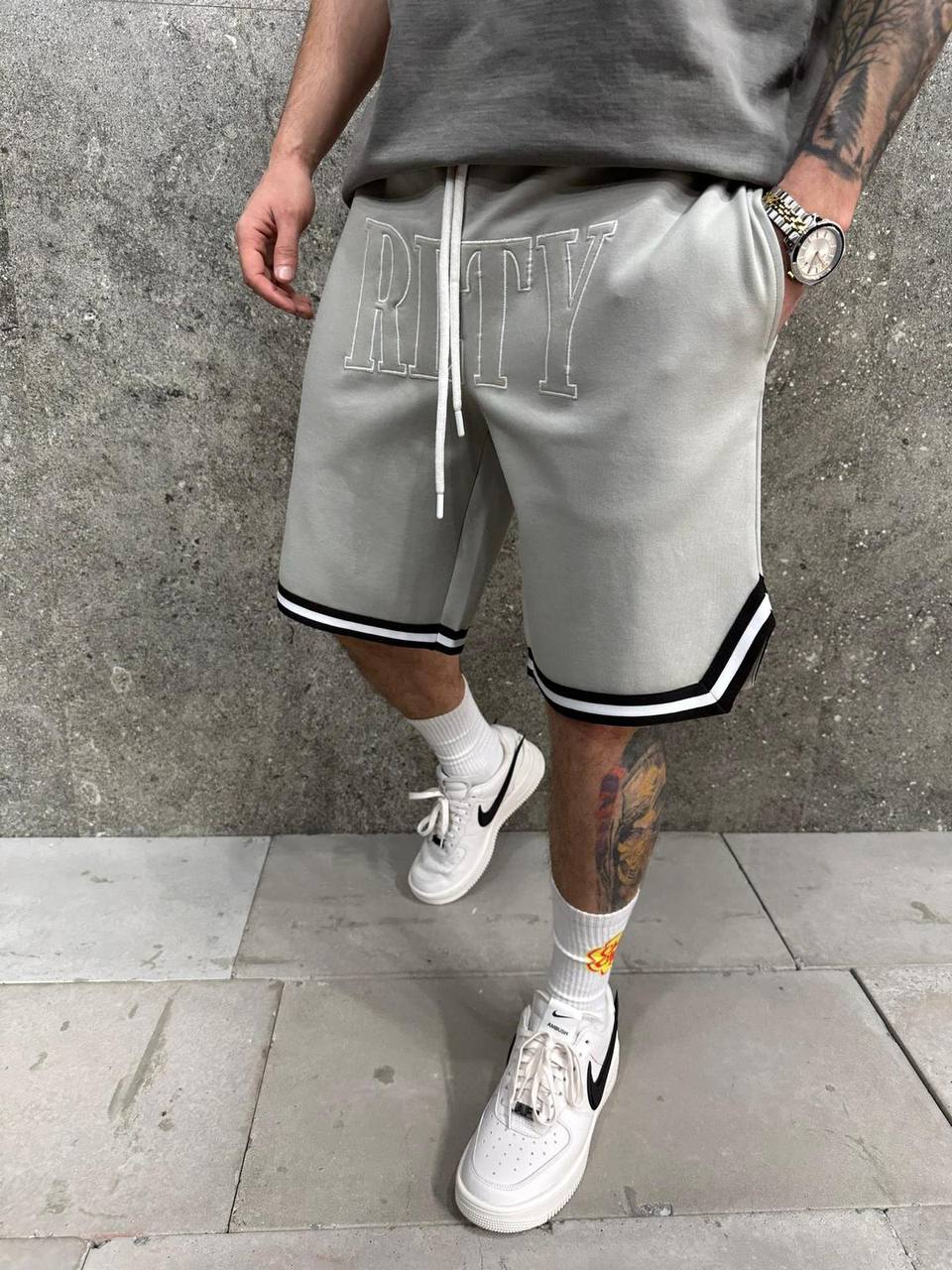 Мужские Плотные Серые Шорты – Свободные Широкие с Вышивкой и Полосками