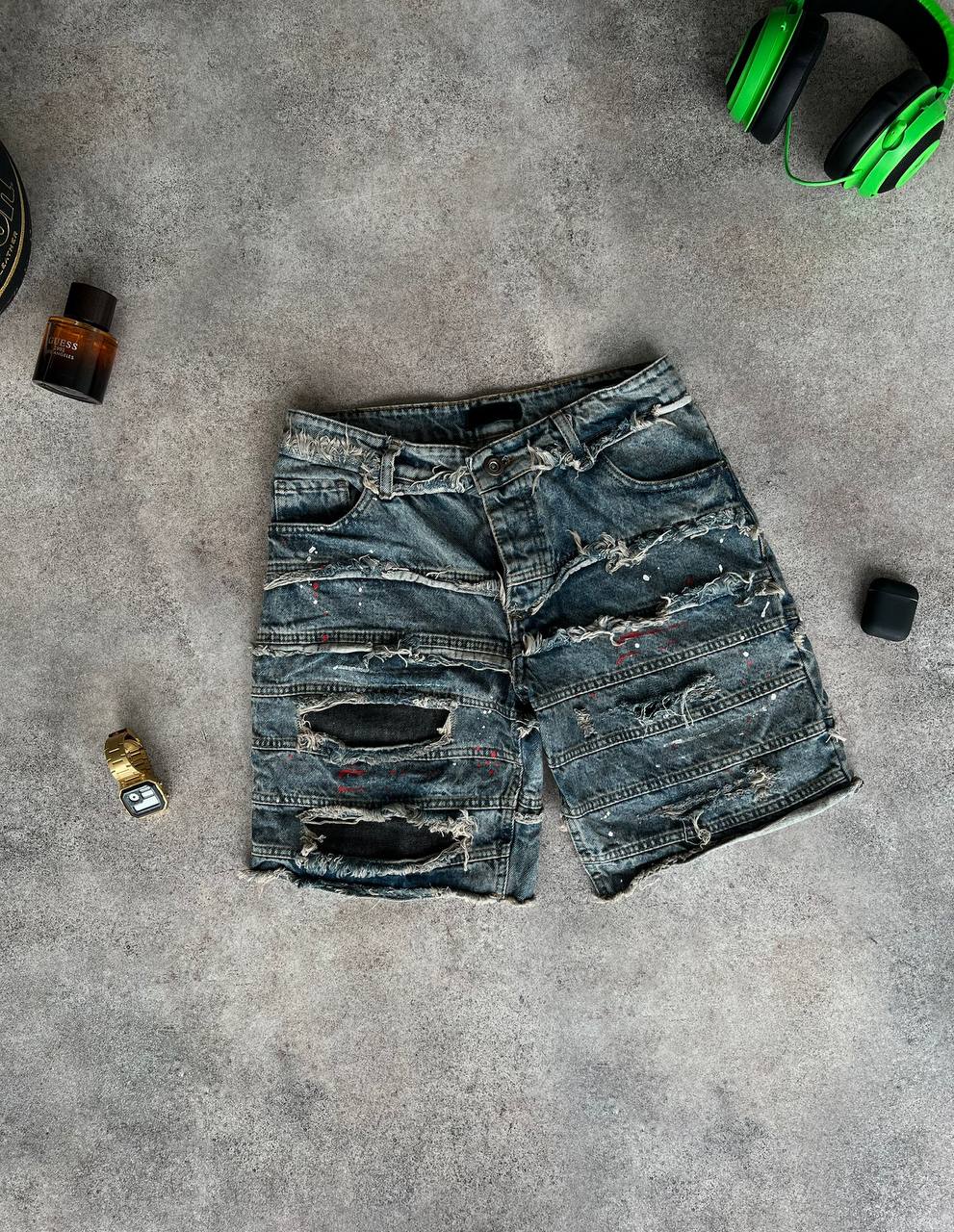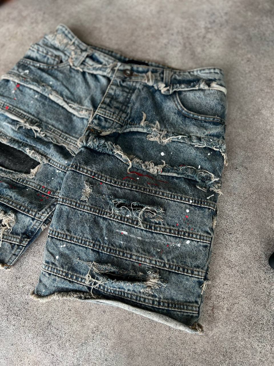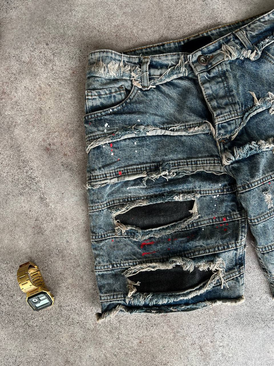 Мужские Синие Рваные Джинсовые Шорты с Декоративными Швами в Брызгах Краски