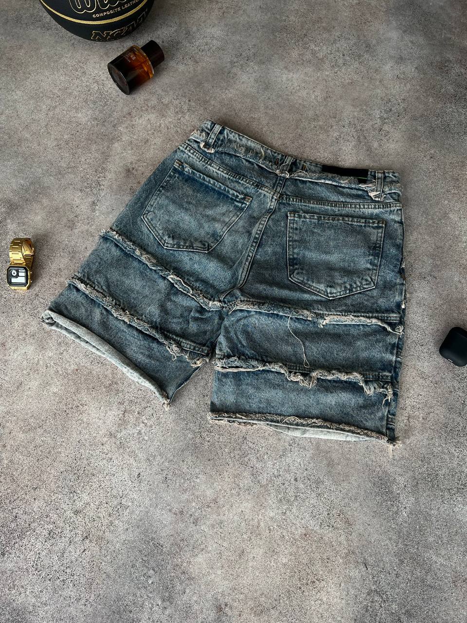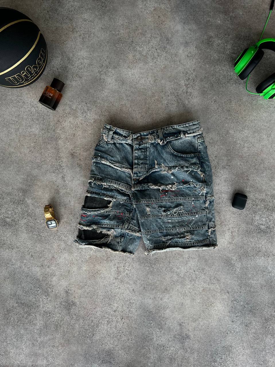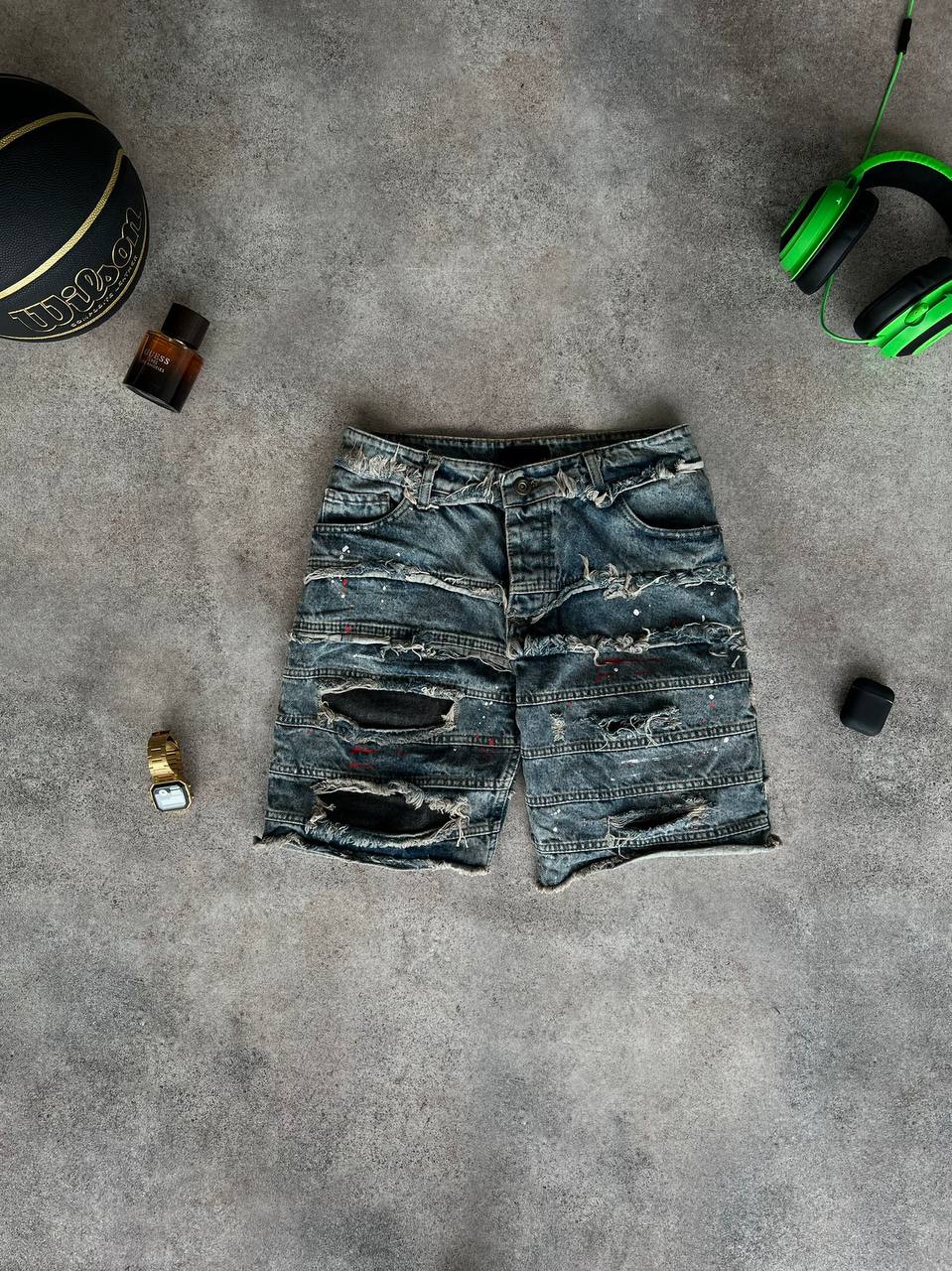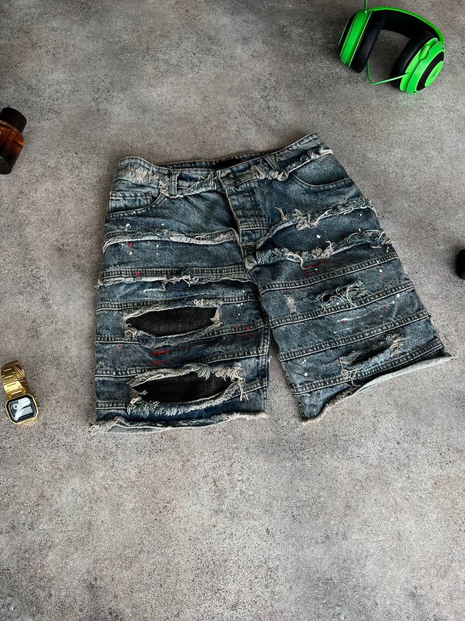 Мужские Синие Рваные Джинсовые Шорты с Декоративными Швами в Брызгах Краски