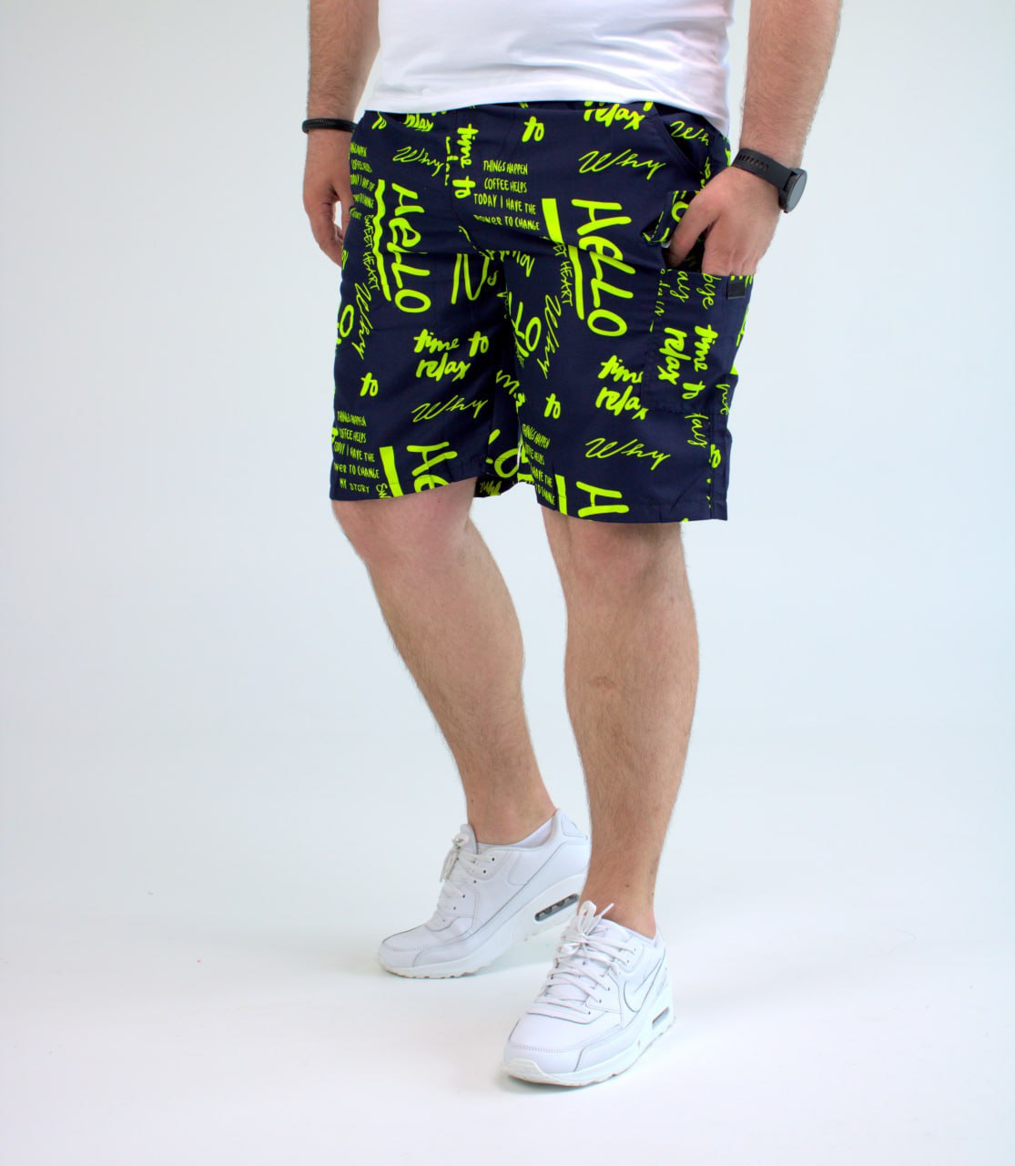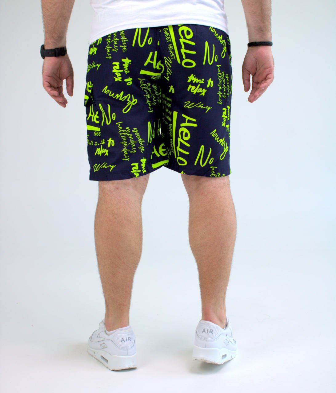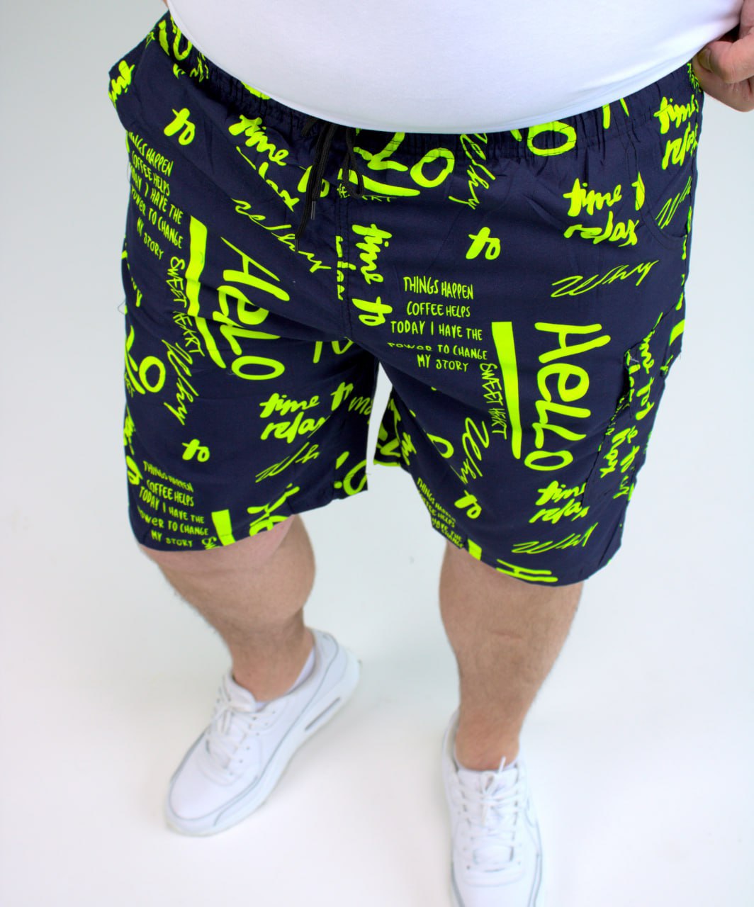 Мужские Темно-Синие Пляжные Шорты Плащевка в Принт Салатовых Надписях (Большие Размеры)