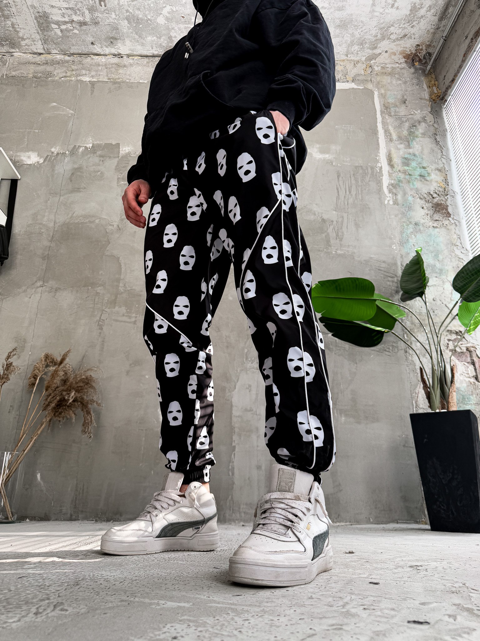 Мужские Черные Спортивные Штаны Джоггеры Плащевка в Принт с Кантом