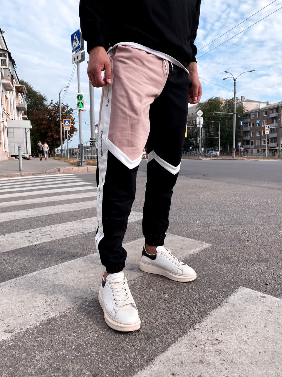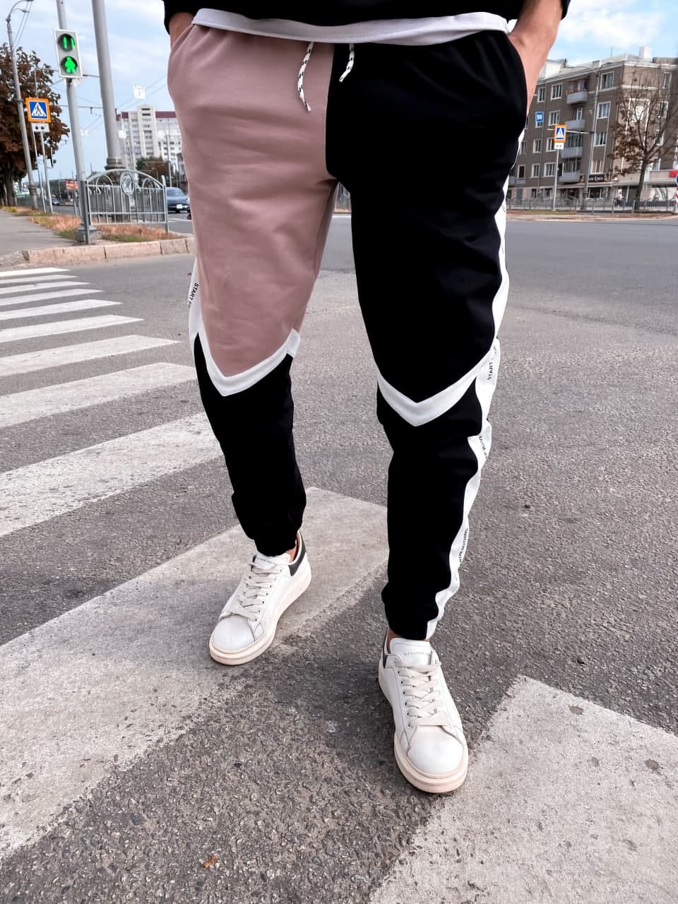 Мужские Черные Спортивные Штаны – Свободные с Манжетами и Бежевыми Вставками + Белые Лампасы