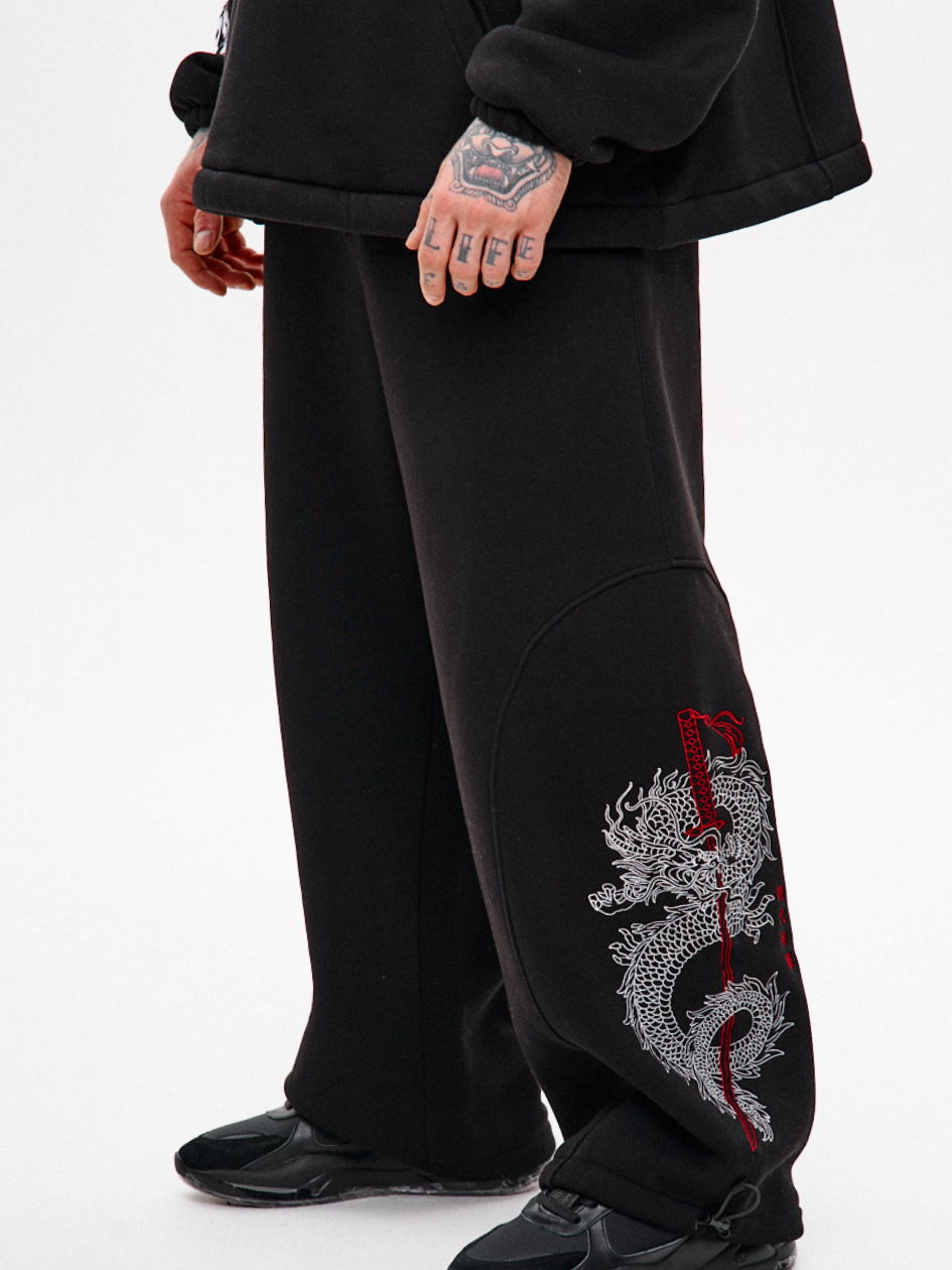 Мужские Широкие Черные Спортивные Штаны с Вышивкой – Утепленные на Флисе