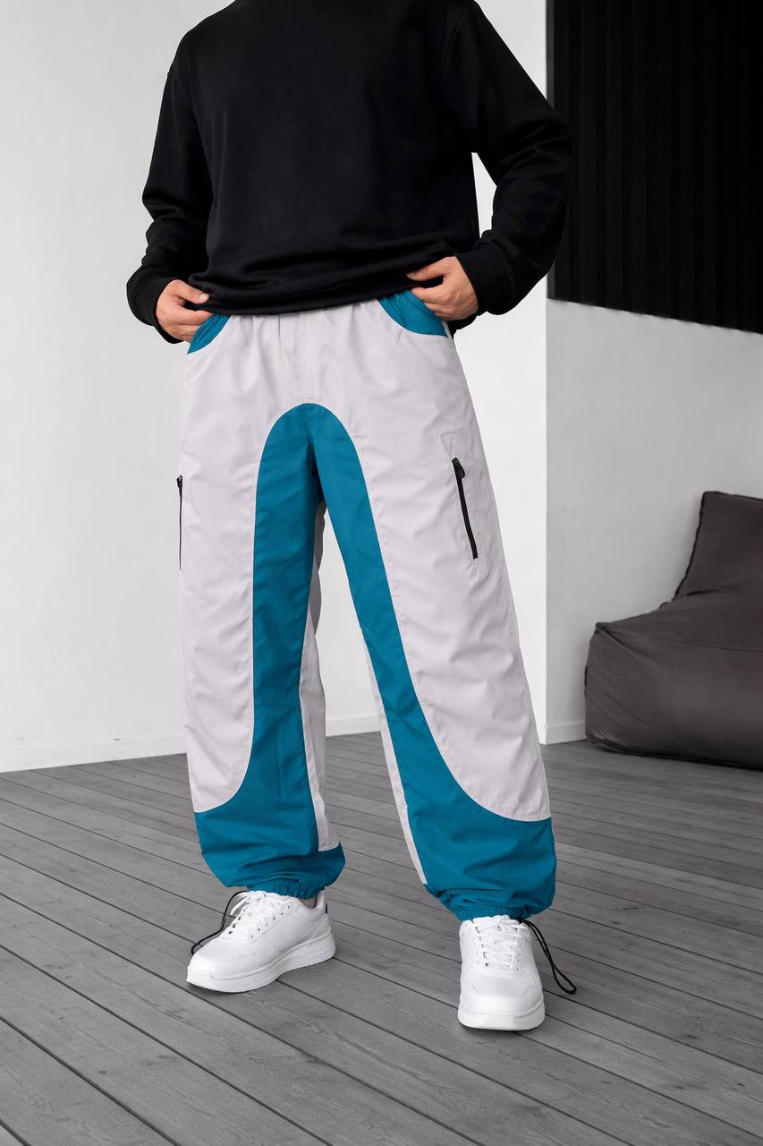 Мужские Широкие Серо-Синие Спортивные Штаны Плащевка с Затяжками Внизу