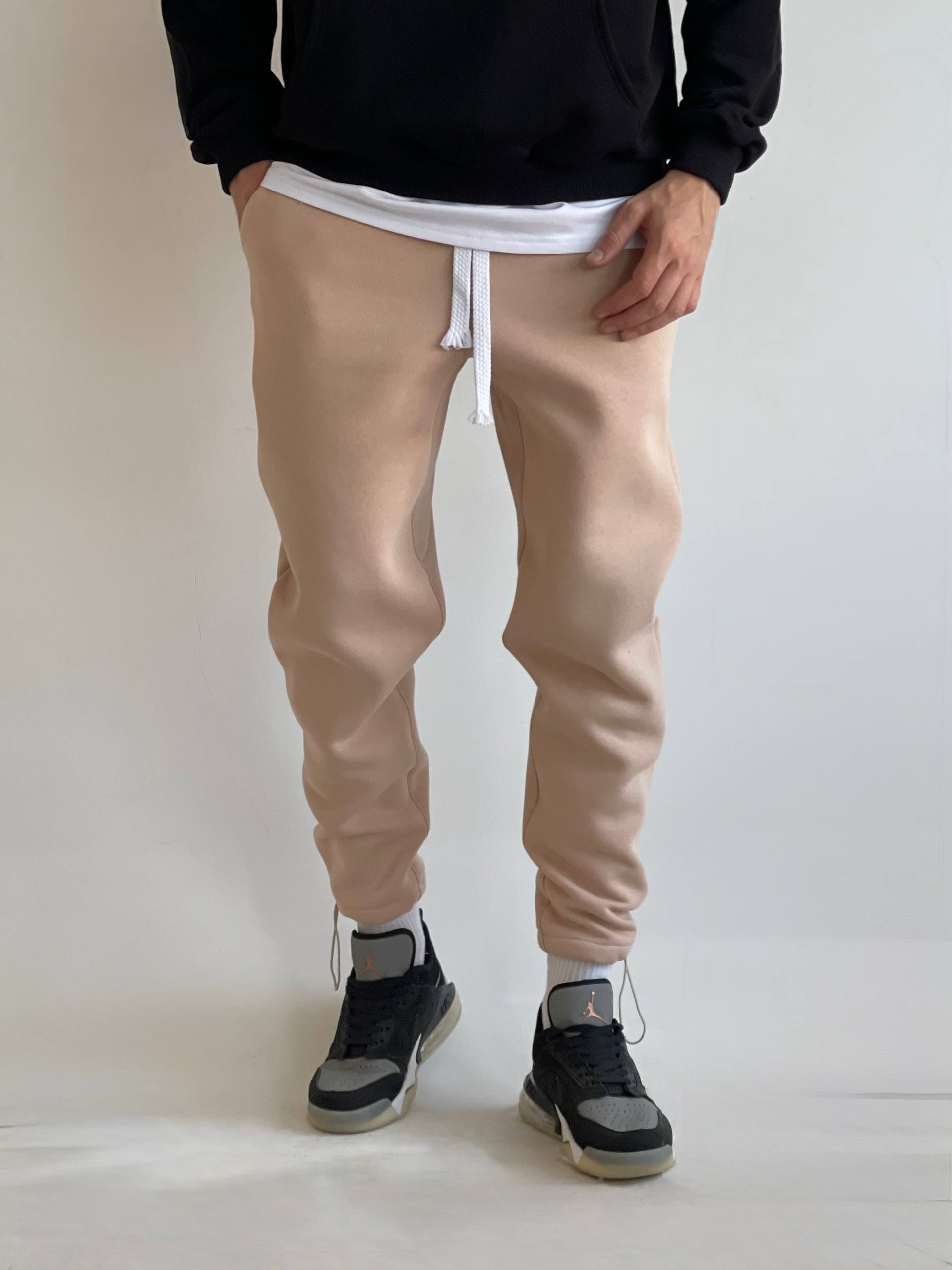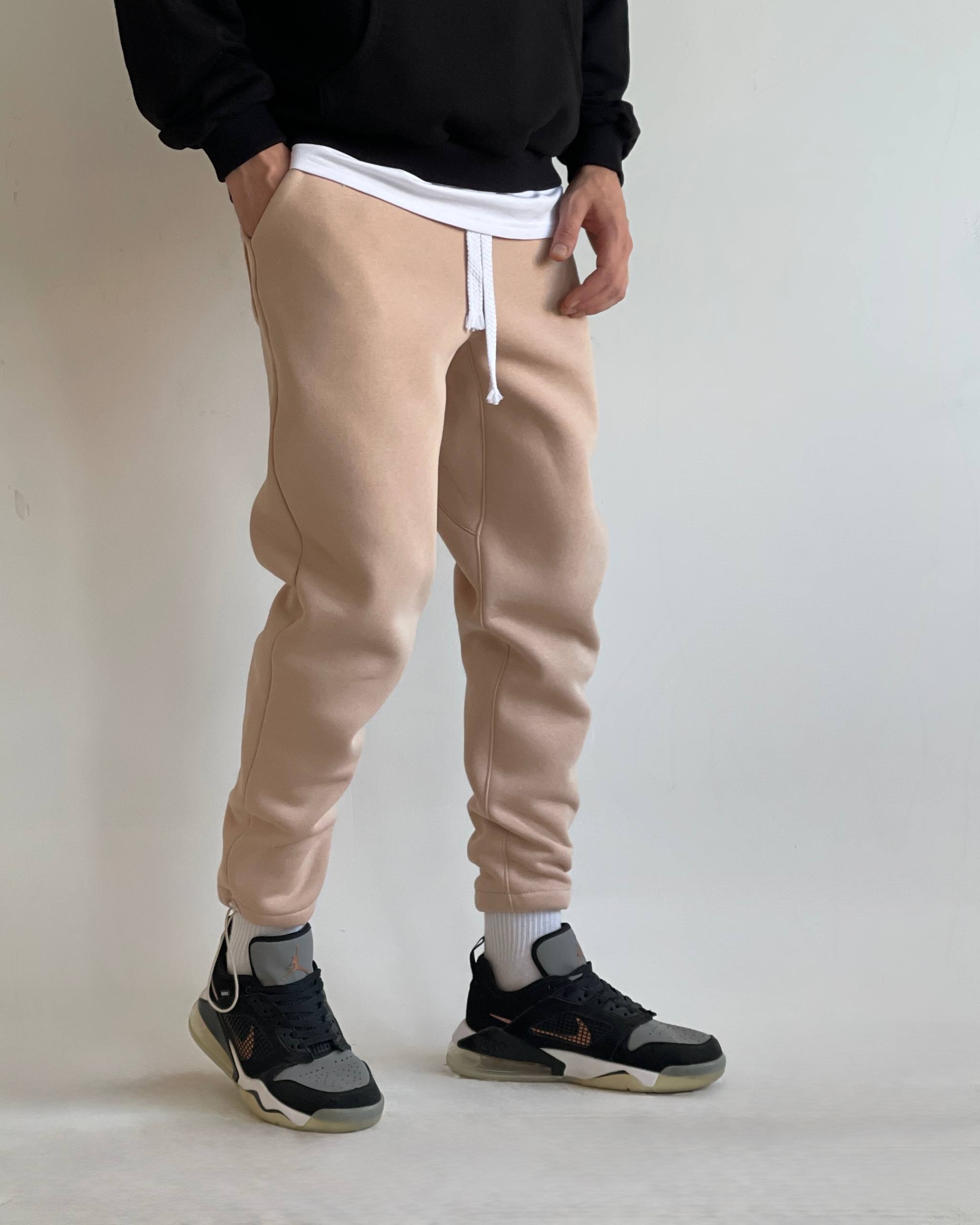 Мужские Утепленные Бежевые Спортивные Штаны на Флисе – Базовые Джоггеры с Затяжками