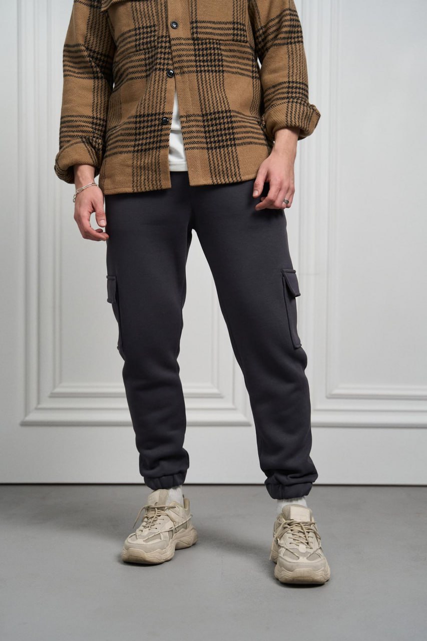 Мужские Утепленные Графитовые Штаны Брюки Карго Трехнитка на Флисе – Свободные с Манжетами и Накладными Карманами