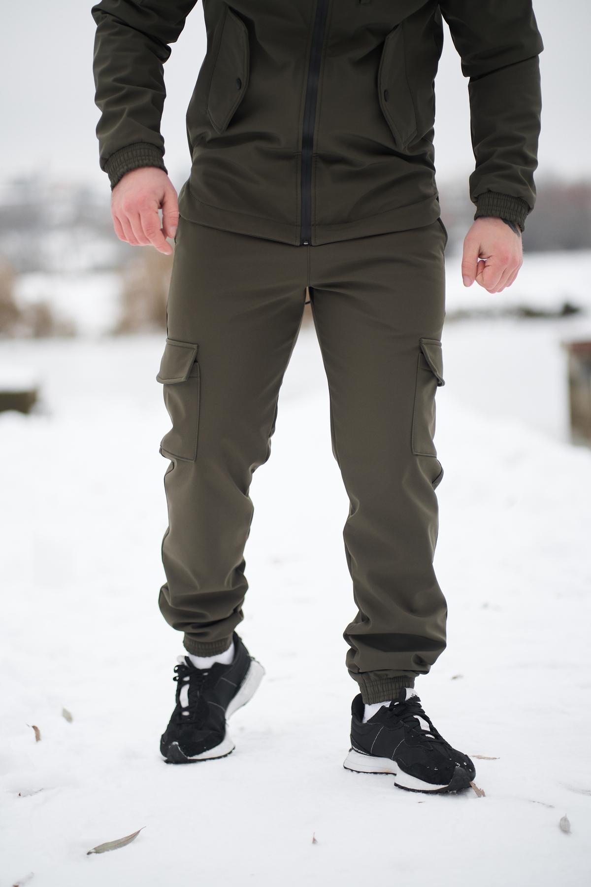 Мужские Утепленные Штаны Брюки Карго Хаки Soft Shell на Флисе – Свободные с Манжетами и Накладными Карманами