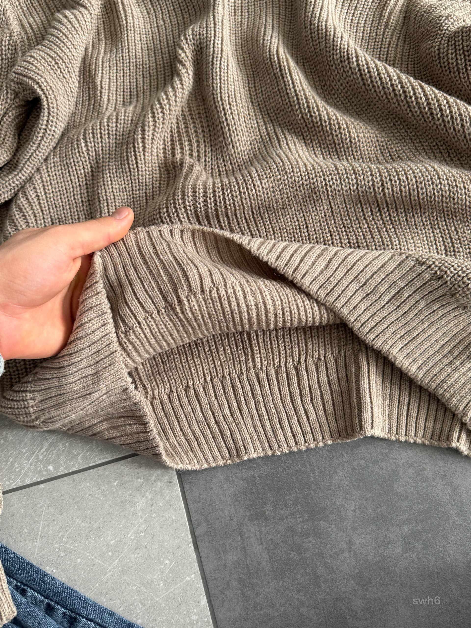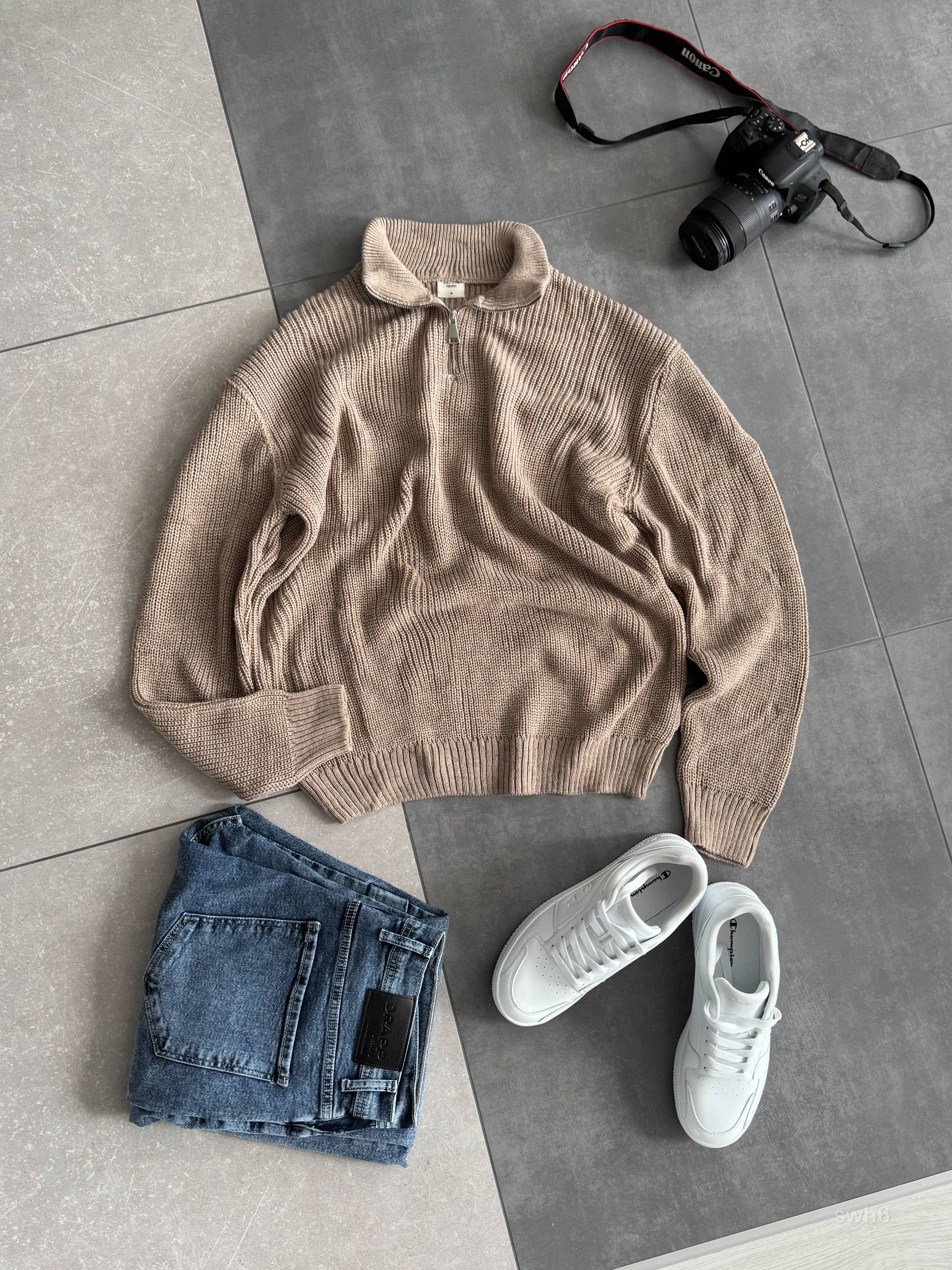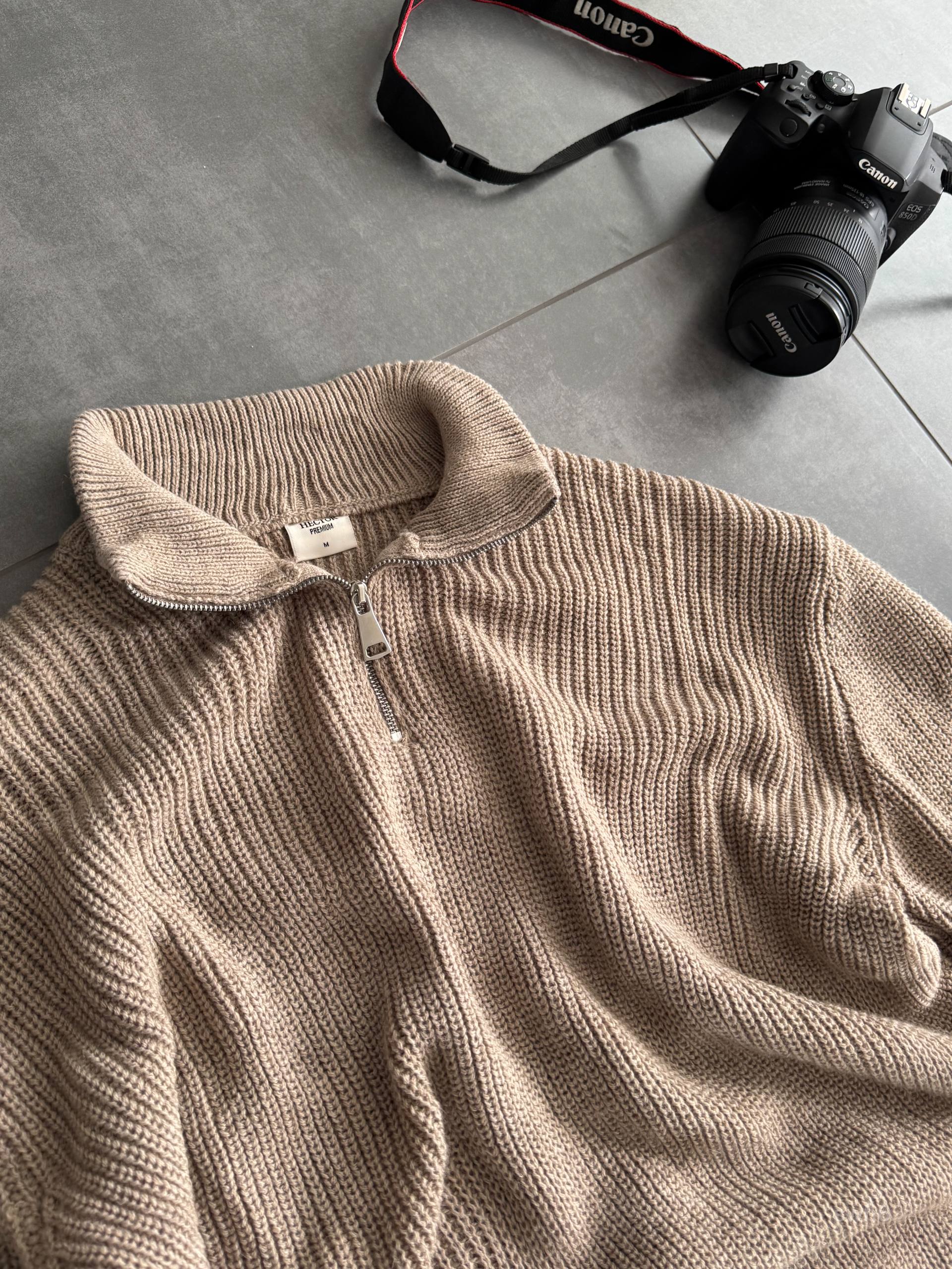 Мужской Базовый Бежевый Свитер Зип – Вязаный с Высокой Горловиной на Замке
