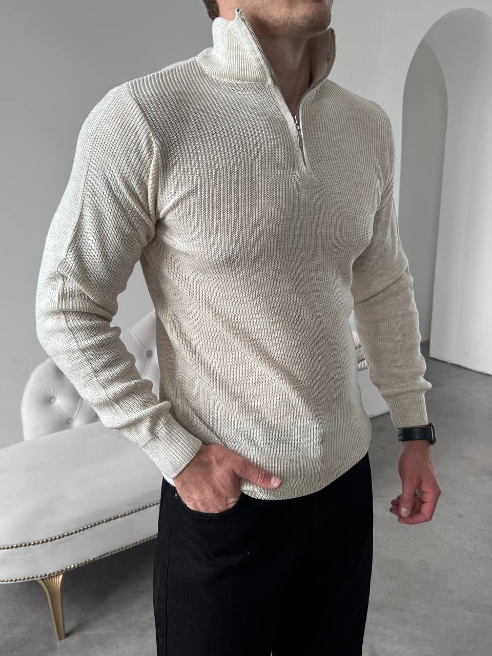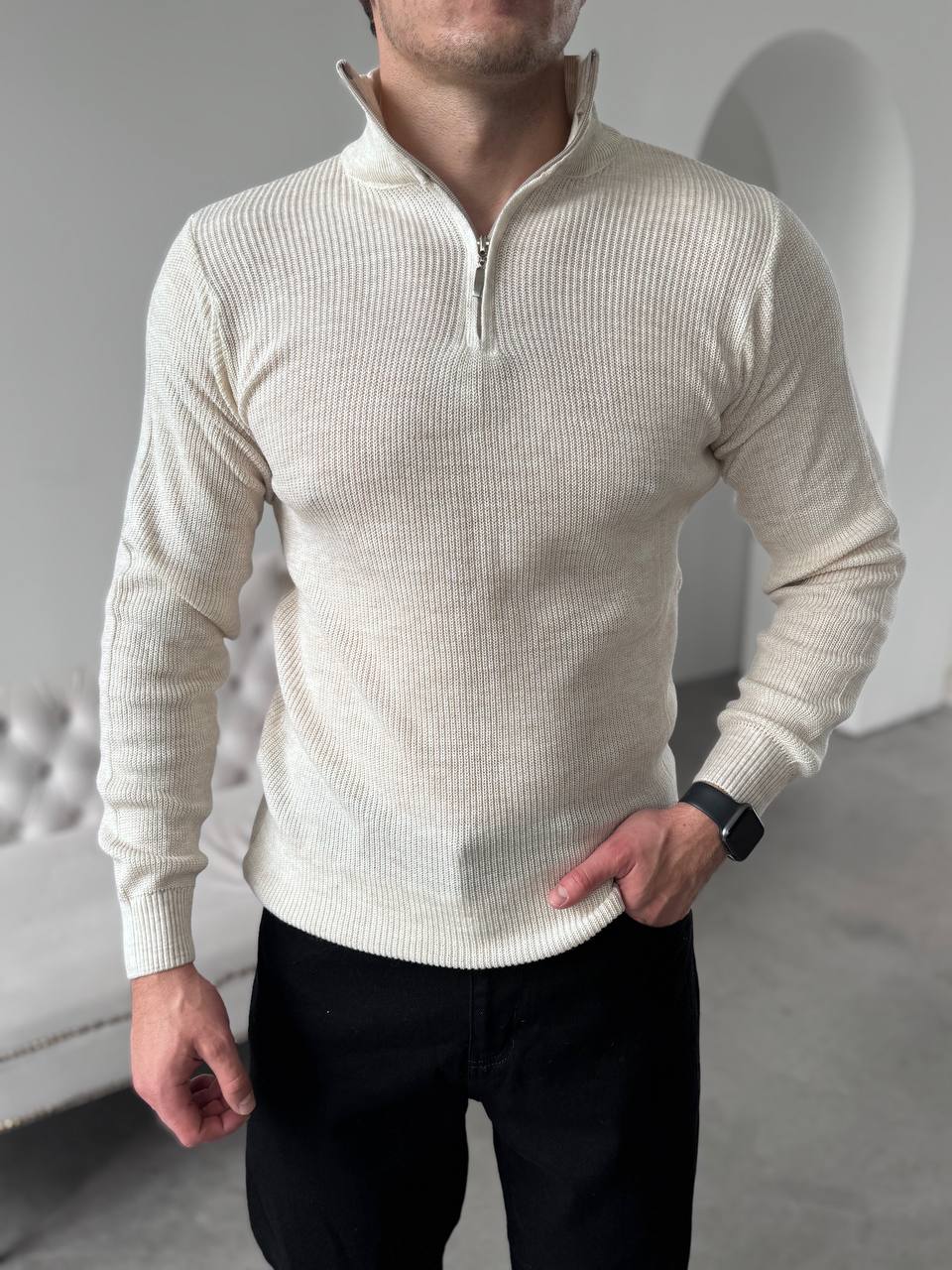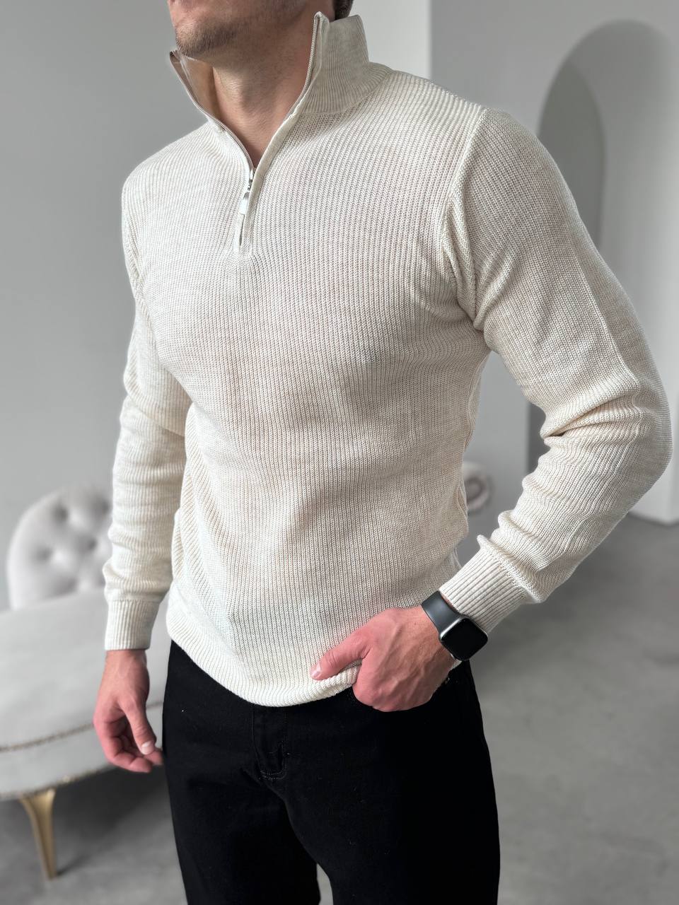 Мужской Базовый Классический Молочный Свитер в Рубчик с Высокой Горловиной на Замке