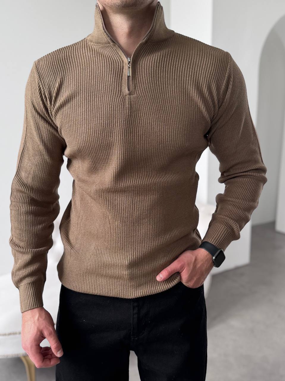 Мужской Базовый Классический Свитер Мокко в Рубчик с Высокой Горловиной на Замке