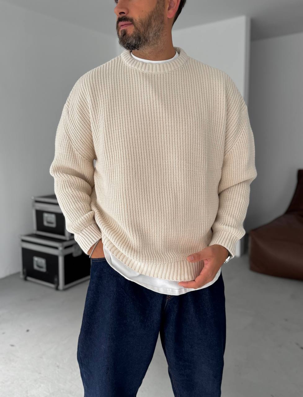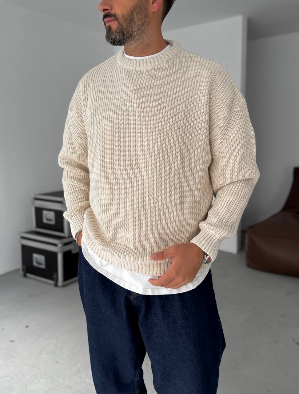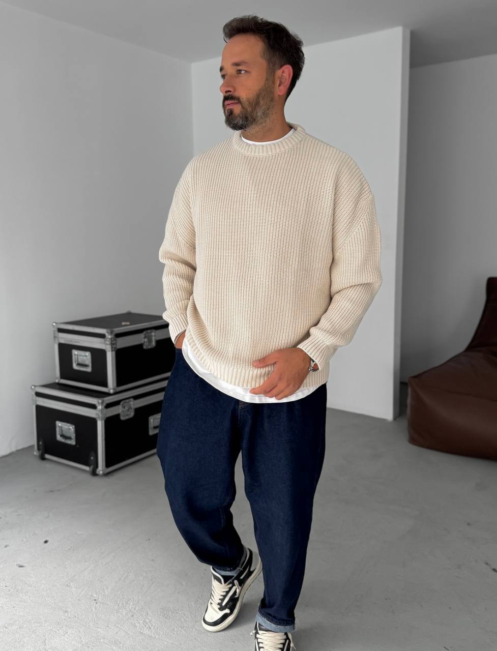 Мужской Базовый Вязаный Бежевый Свитер Хлопок Оверсайз