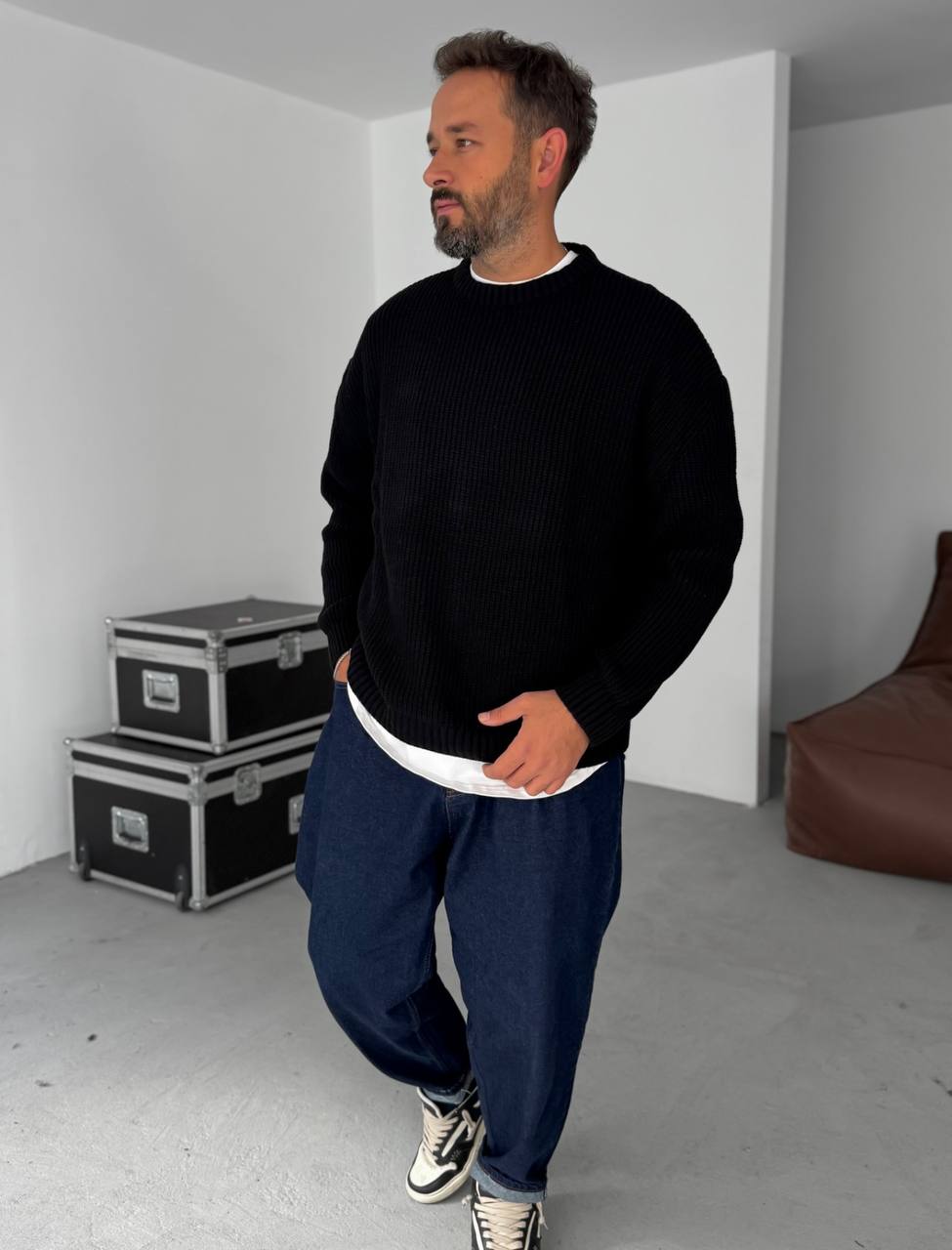 Мужской Базовый Вязаный Черный Свитер Хлопок Оверсайз