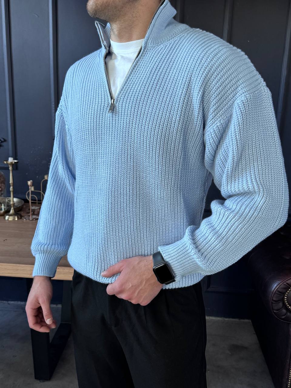 Мужской Базовый Вязаный Голубой Свитер с Высокой Горловиной на Замке