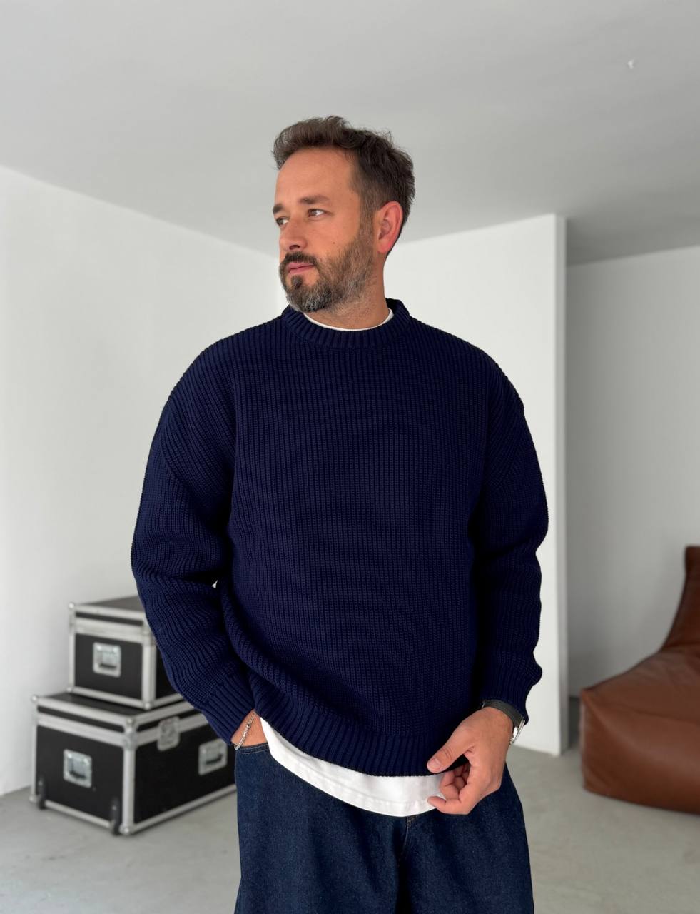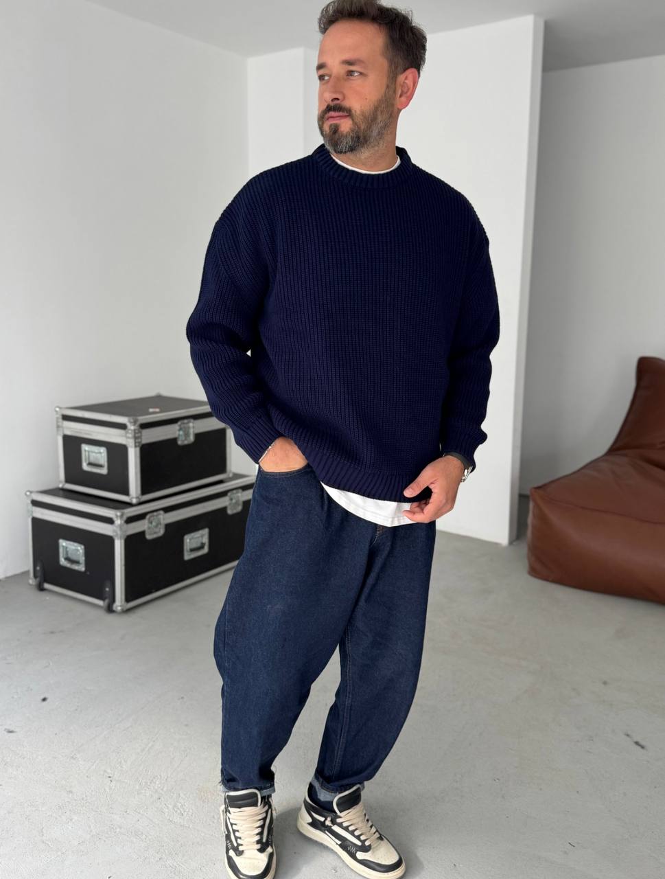 Мужской Базовый Вязаный Темно-Синий Свитер Хлопок Оверсайз