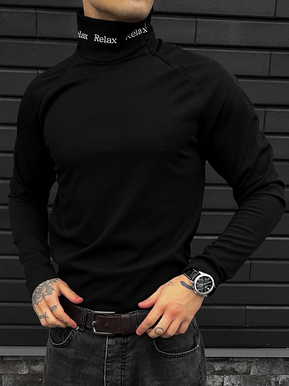 Мужской Черный Гольф на Флисе в Рубчик – Теплый под Горло с Надписью “Relax” на Воротнике