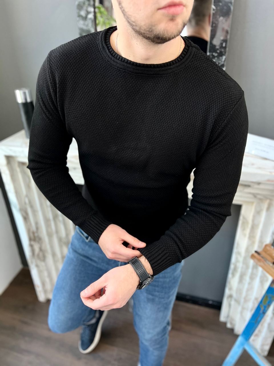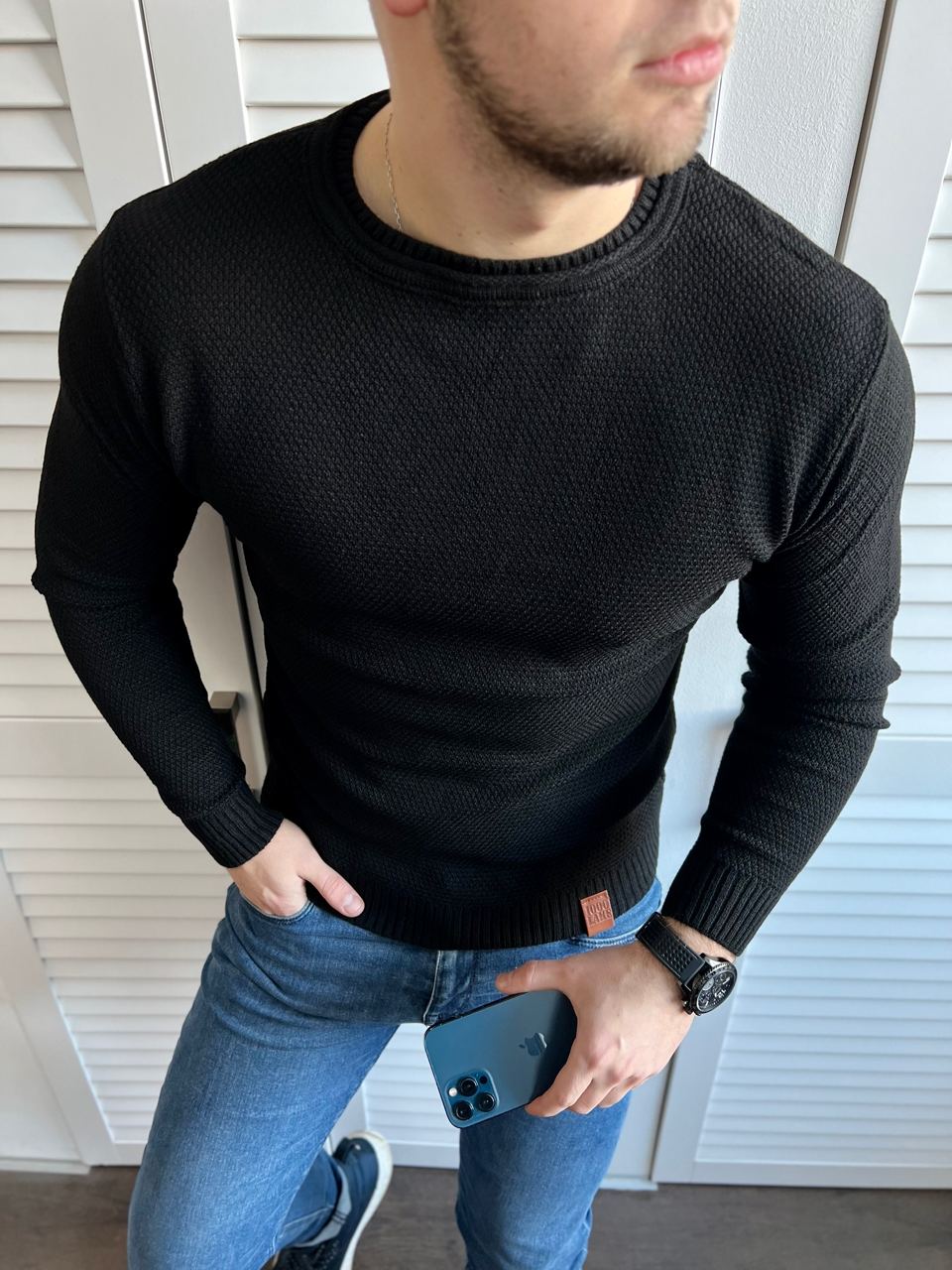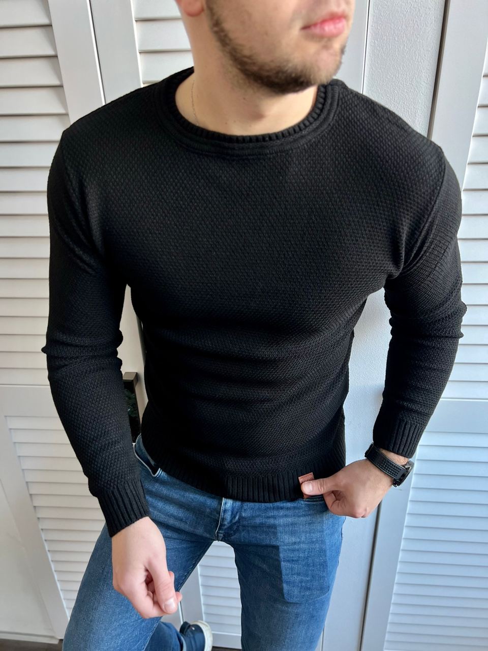 Мужской Черный Свитер – Базовый Приталенный с Круглым Вырезом Горловины