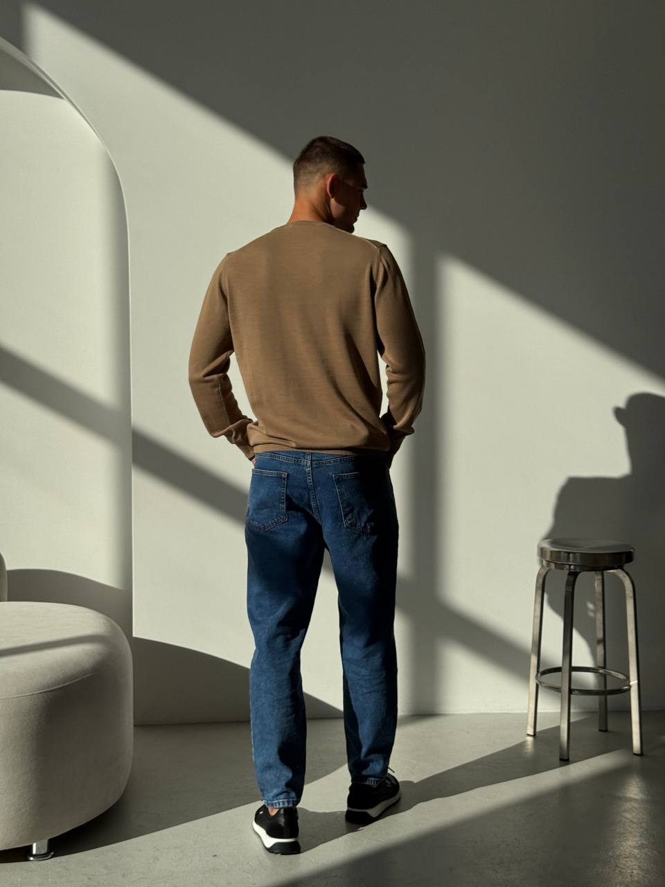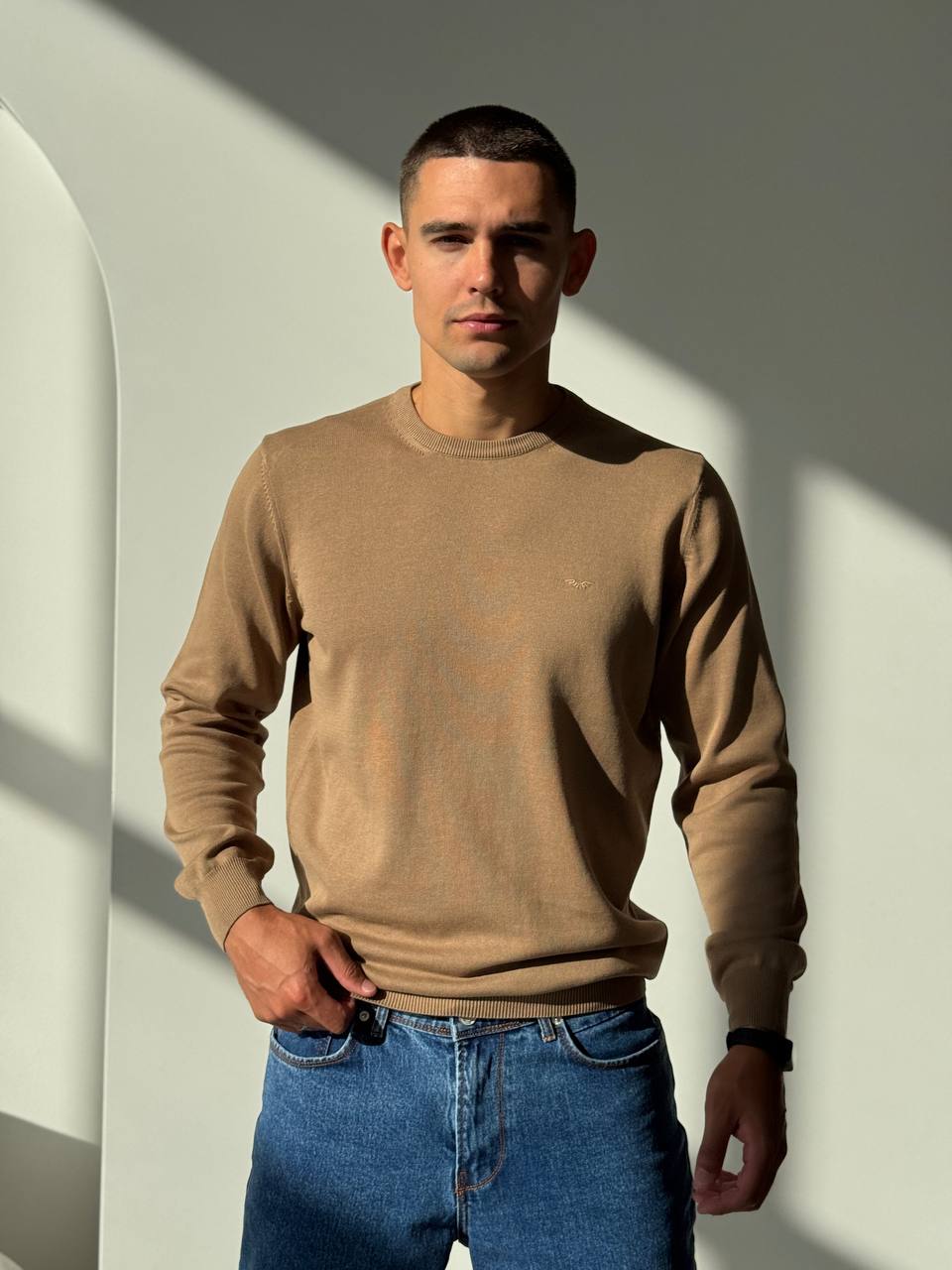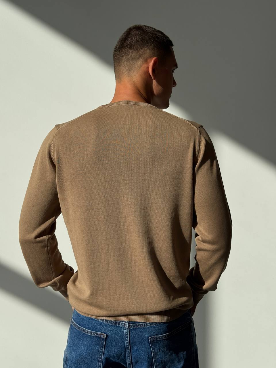 Мужской Классический Свитер Мокко с Круглым Вырезом и Маленькой Вышивкой
