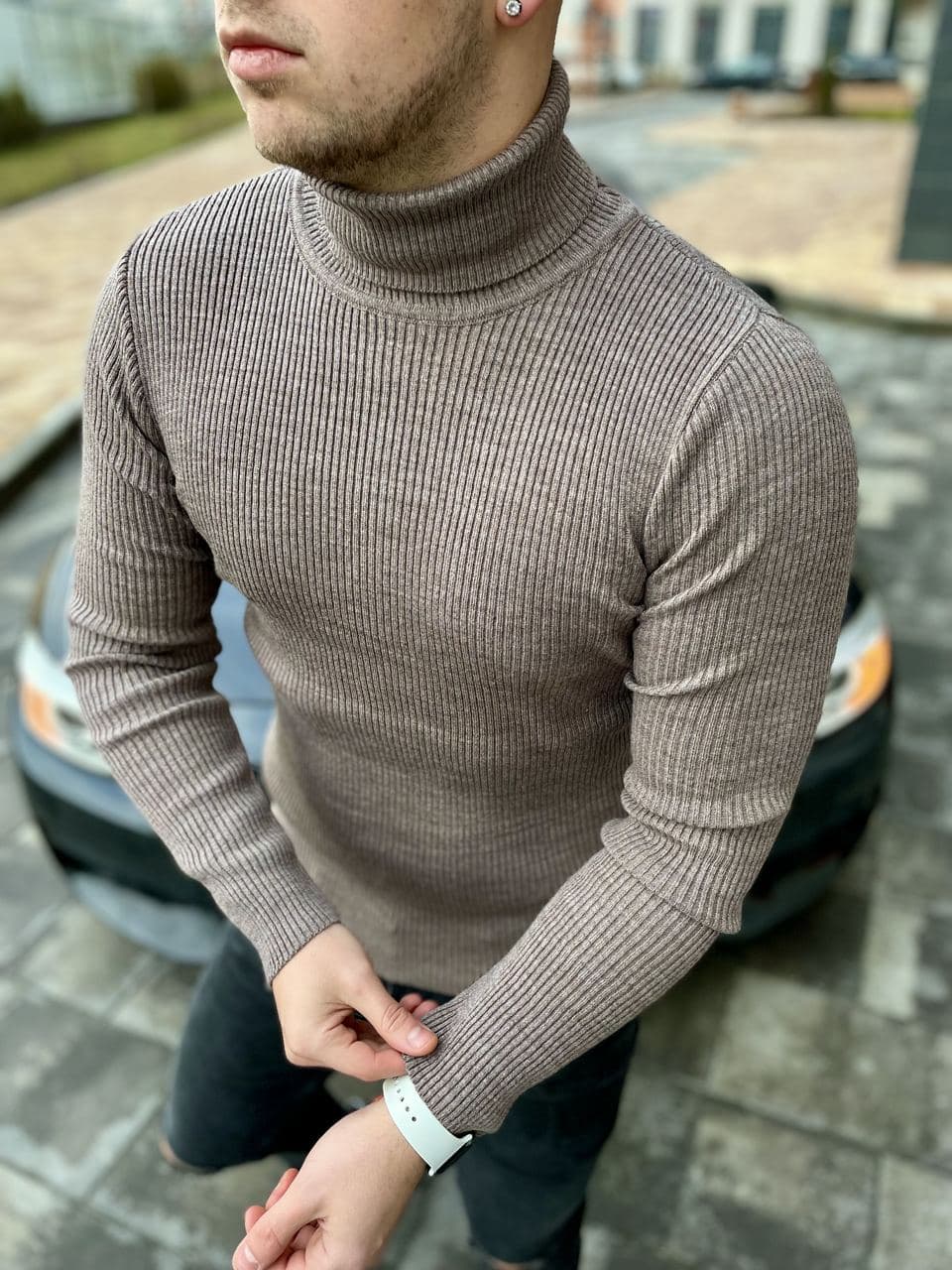 Мужской Коричневый Свитер Гольф – в Рубчик Классический Приталенного Кроя