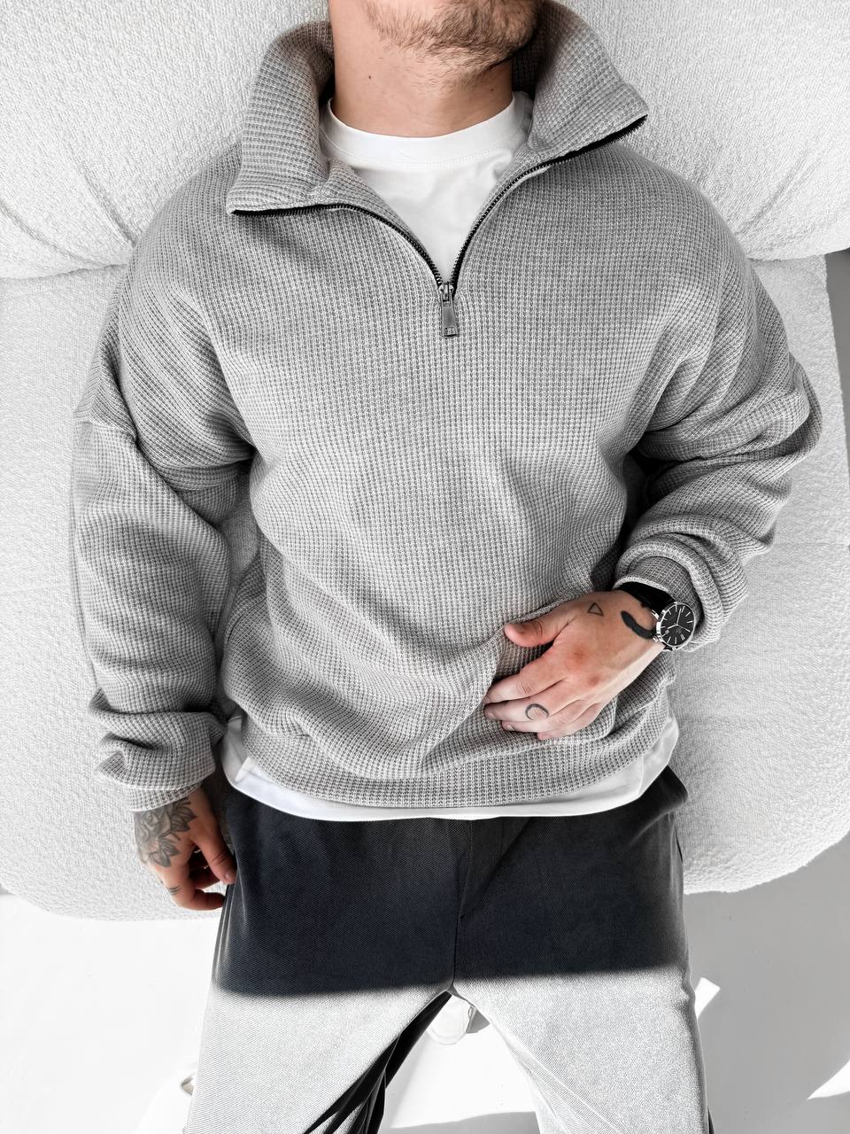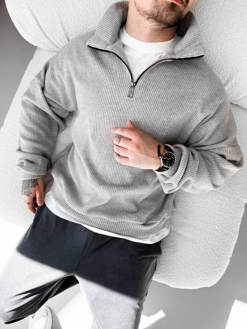 Мужской Серый Свитер Свободного Кроя – Вязаный с Зип Воротником на Змейке