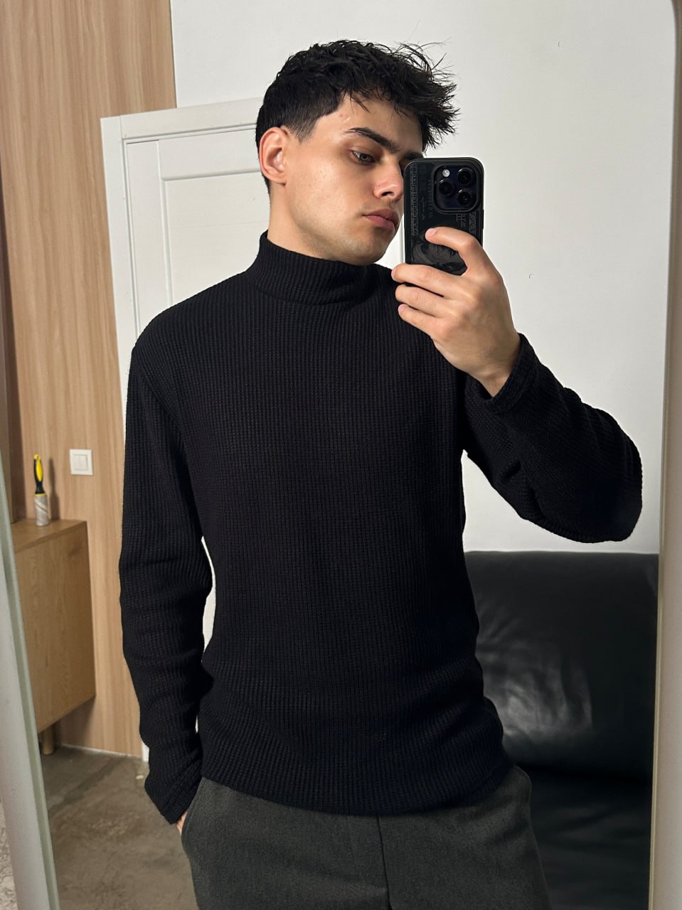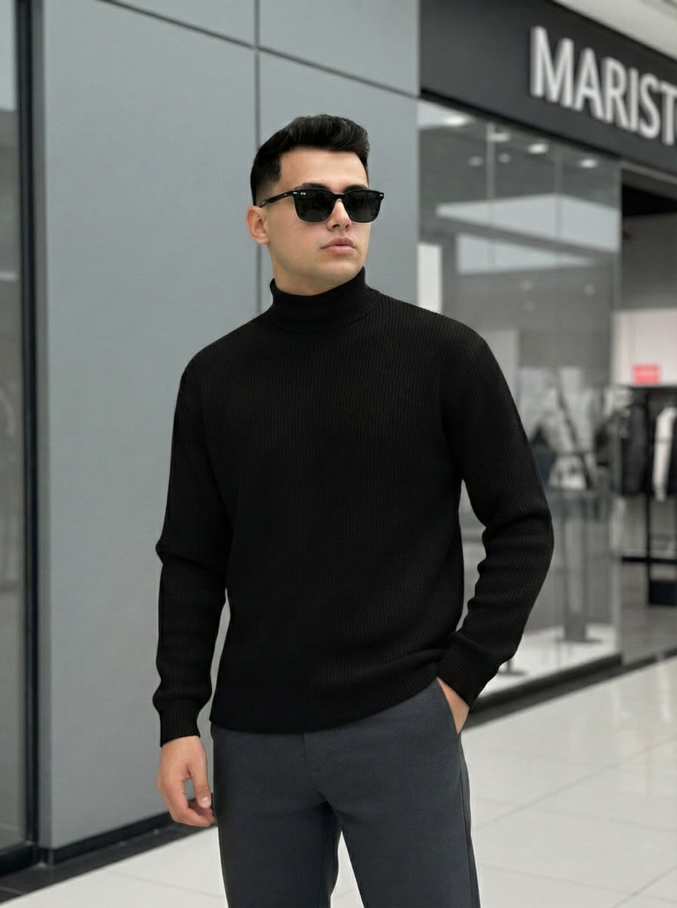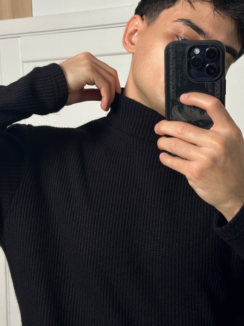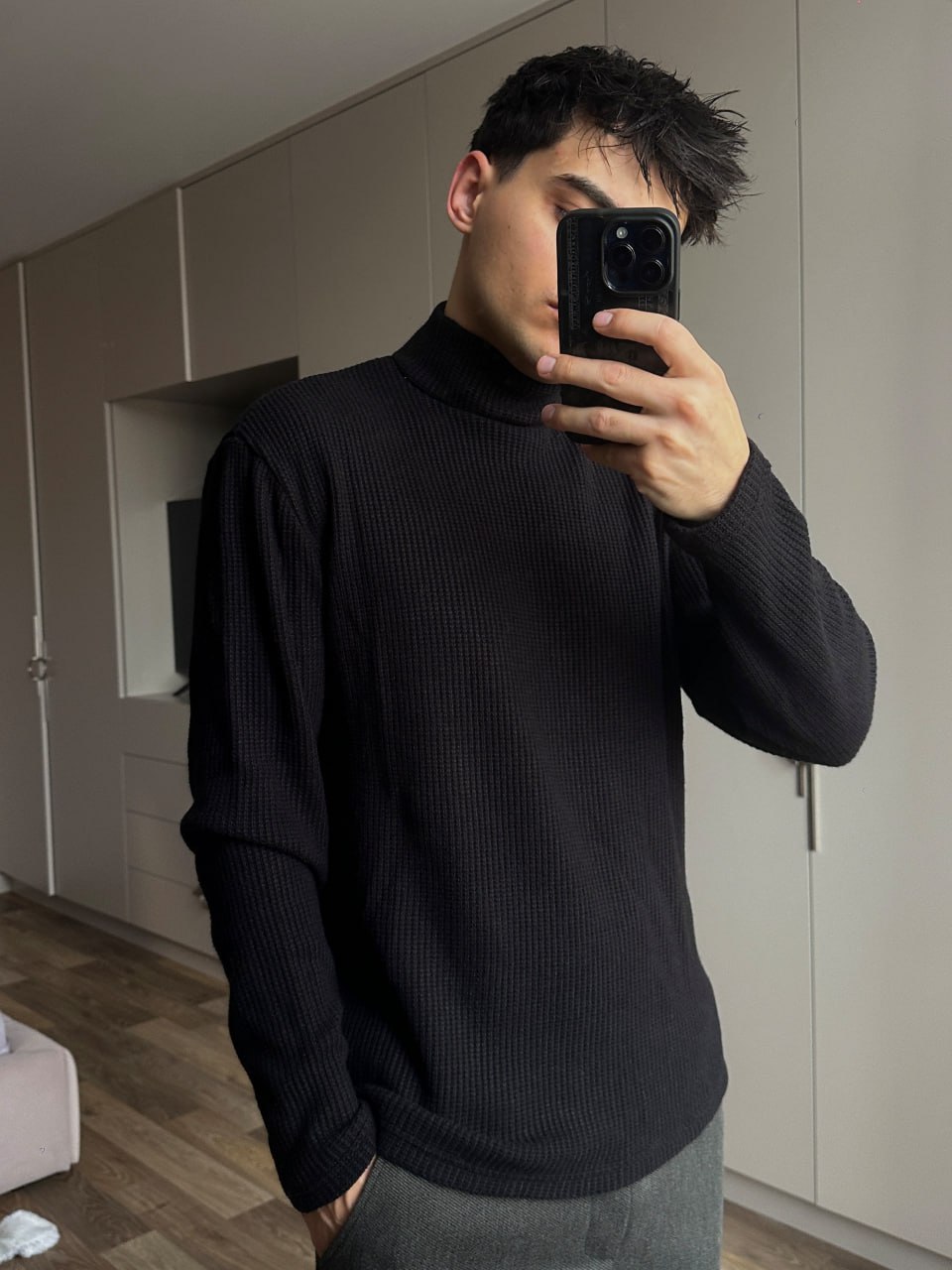 Мужской Свободный Базовый Черный Гольф с Воротником Стойкой