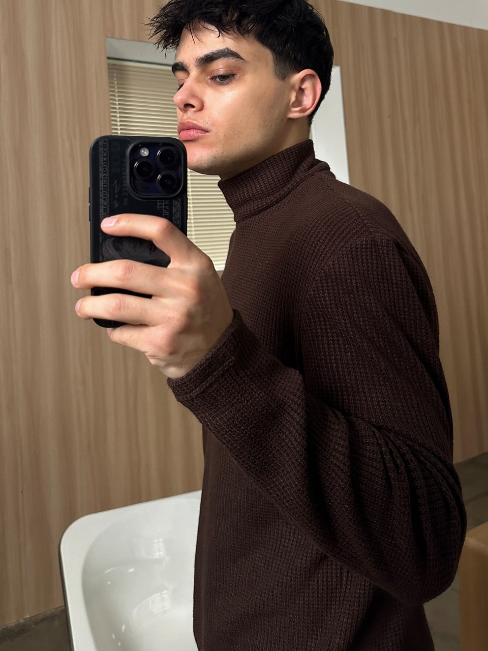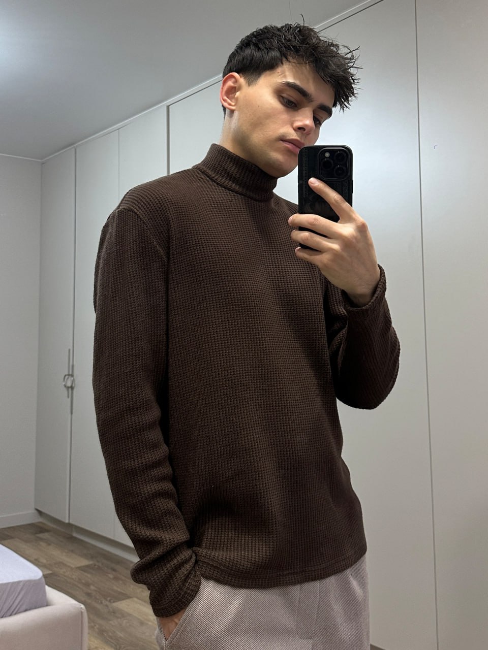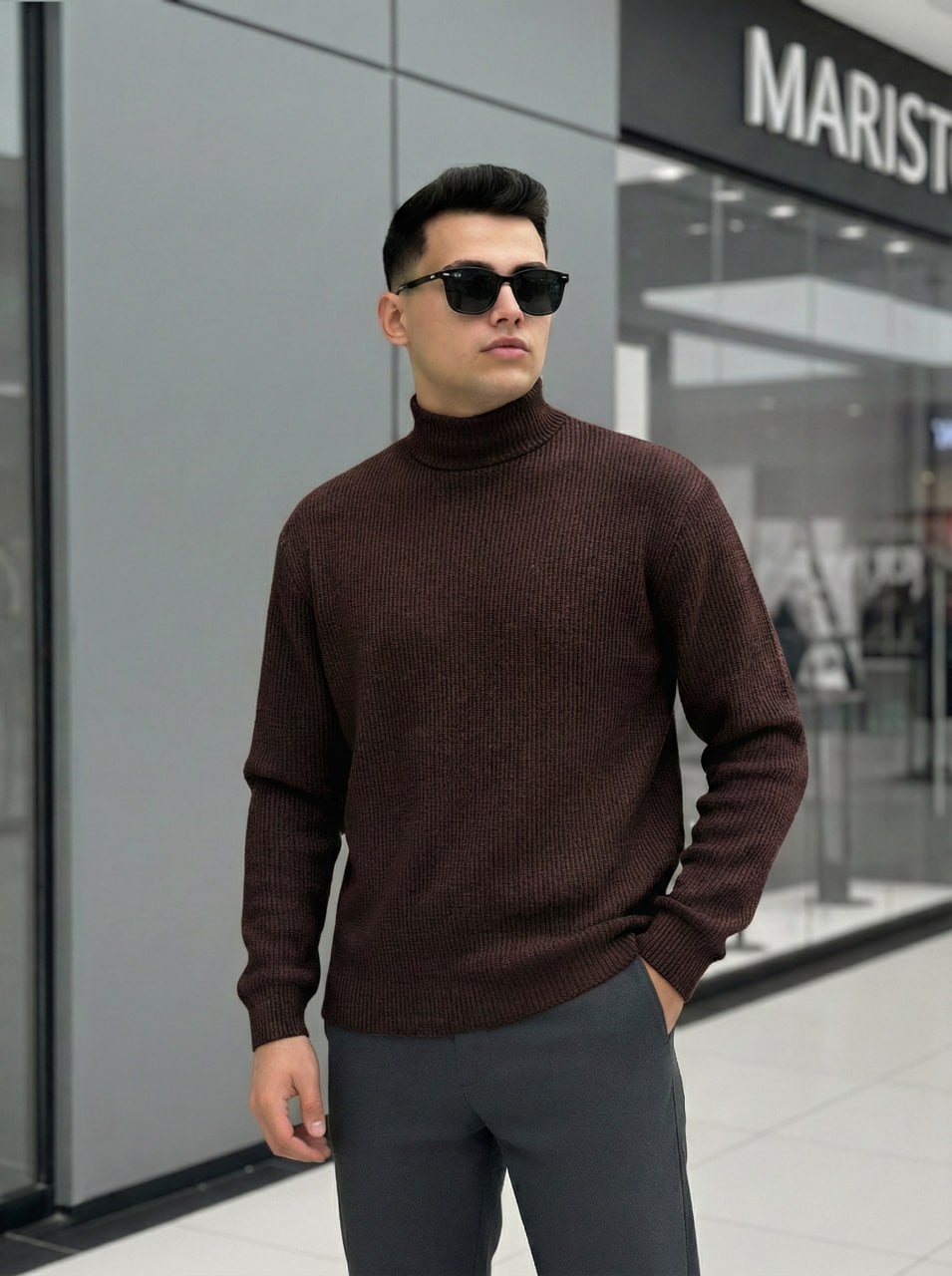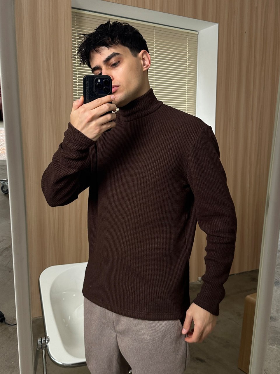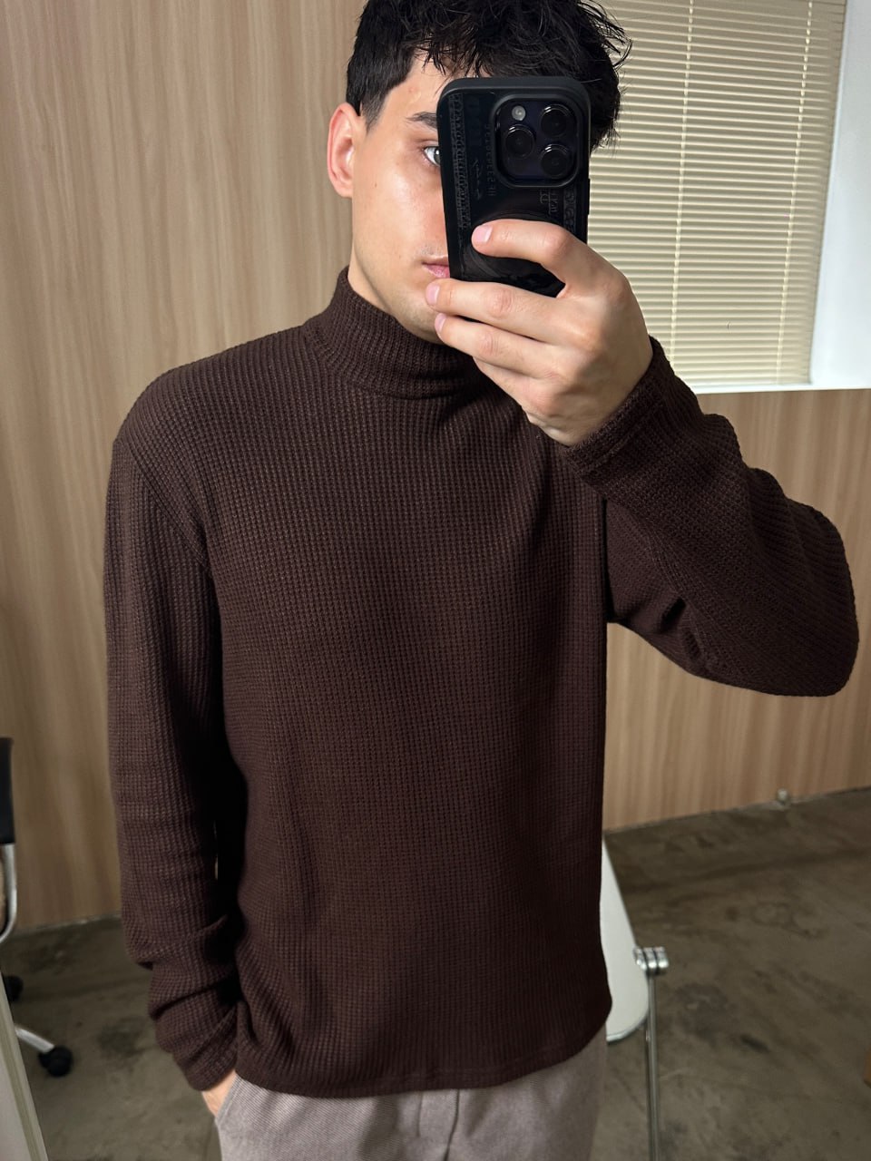 Мужской Свободный Базовый Коричневый Гольф с Воротником Стойкой